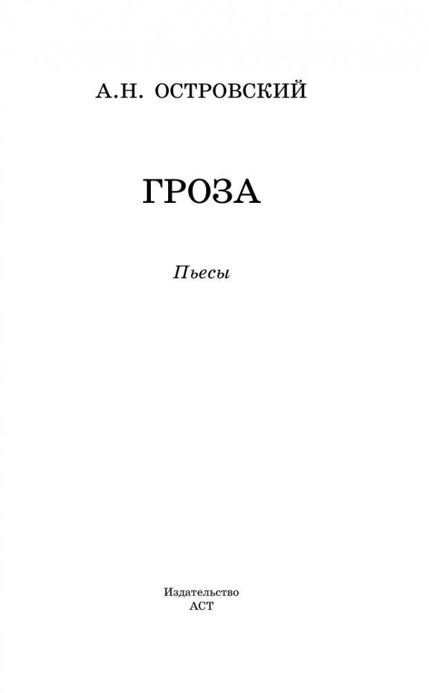 Александр Николаевич Островский (1823 – 1886) – русский драматург, творчество которого стало важнейшим этапом развития русского национального театра. Действие пьесы «Гроза» происходит летом в вымышленном городе Калинове на берегу реки Волги. В семействе Кабановых царит домострой, всем заправляет мать Тихона – Марфа Игнатьевна Кабанова. Жена Тихона Катерина, главная героиня, в доме своих родителей жила в любви и ласке. Все изменилось, когда она вышла замуж за Тихона. И вот Катерина влюбляется в Бориса – племянника Дик?го. Борис тоже тайно влюблён в нее. Катерина признаётся мужу в измене, и жизнь ее становится совершенно невыносимой… В сборник вошли также пьесы «Бесприданница» и «Доходное место».
