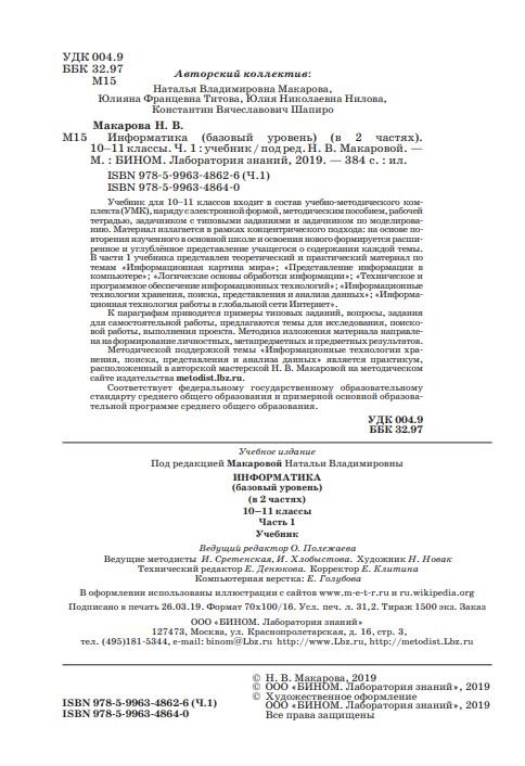 Учебное издание для 10–11 классов входит в состав учебно-методического комплекта (УМК), наряду с электронной формой, методическим пособием и рабочей тетрадью. Материал излагается в рамках концентрического подхода: на основе повторения изученного в основной школе и освоения нового формируется расширенное и углубленное представление учащегося о содержании каждой темы. В части 1 учебного издания представлен теоретический и практический материал по темам «Информационная картина мира»; «Представление информации в компьютере»; «Логические основы обработки информации»; «Техническое и программное обеспечение информационных технологий»; «Информационные технологии хранения, поиска, представления и анализа данных»; «Информационная технология работы в глобальной сети Интернет». К параграфам приводятся примеры типовых заданий, задания для самостоятельной работы, контрольные вопросы, предлагаются темы для исследования, поисковой работы, выполнения проекта. Методика изложения материала направлена на формирование личностных, метапредметных и предметных результатов. Методической поддержкой темы «Информационные технологии хранения, поиска, представления и анализа данных» является электронное приложение в авторской мастерской Н.В. Макаровой на методическом сайте издательства, где приведён комплекс задач для всех изучаемых сред общего назначения. Освоение всех предлагаемых заданий обеспечит профессиональный уровень работы учащегося в офисных средах. Соответствует федеральному государственному образовательному стандарту среднего общего образования и примерной основной образовательной программе среднего общего образования.