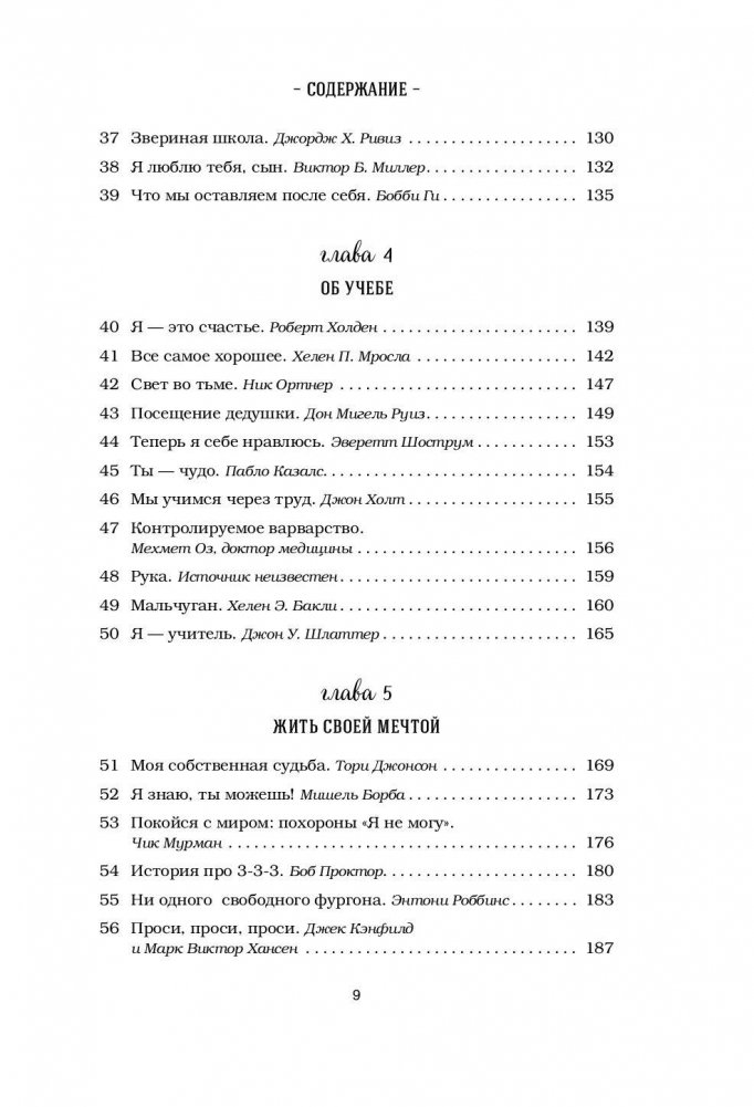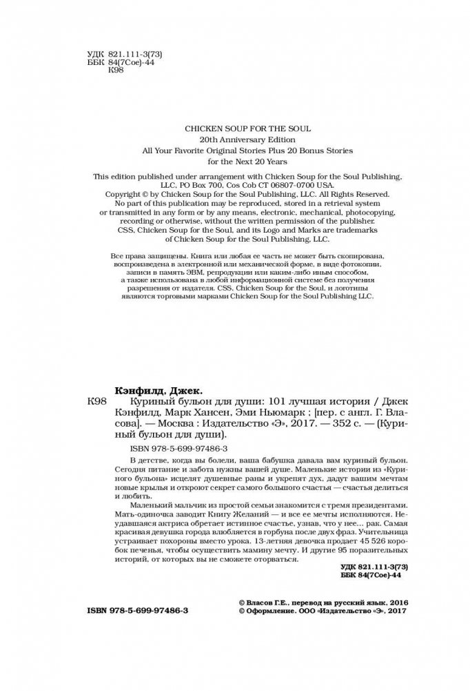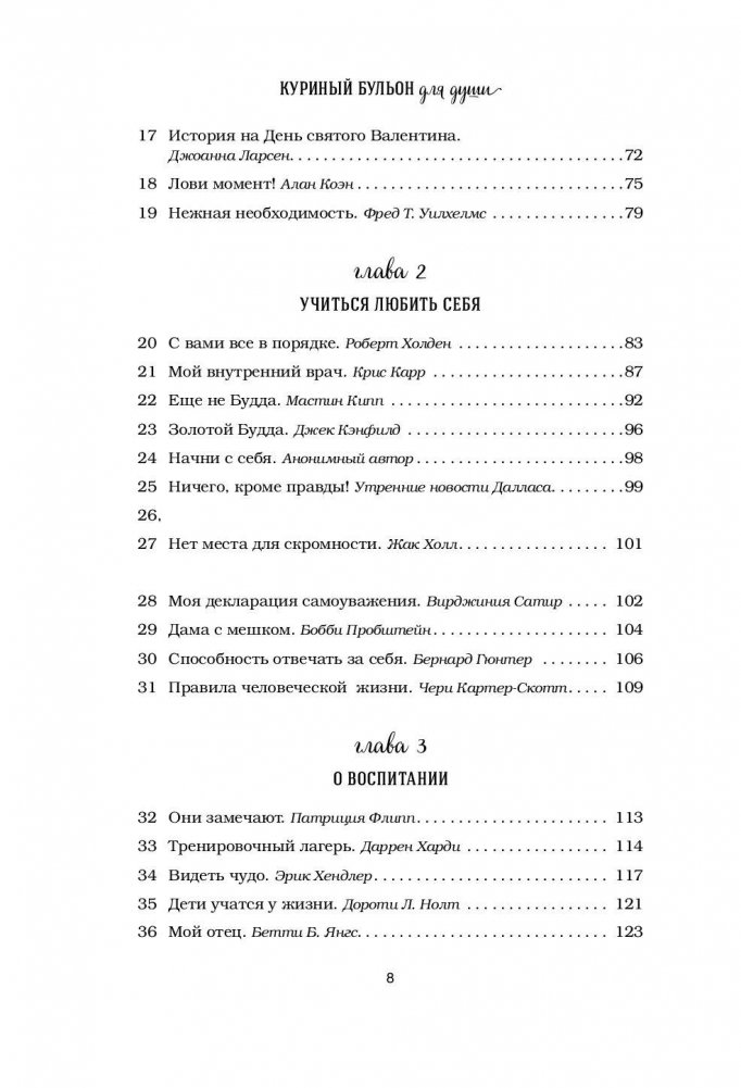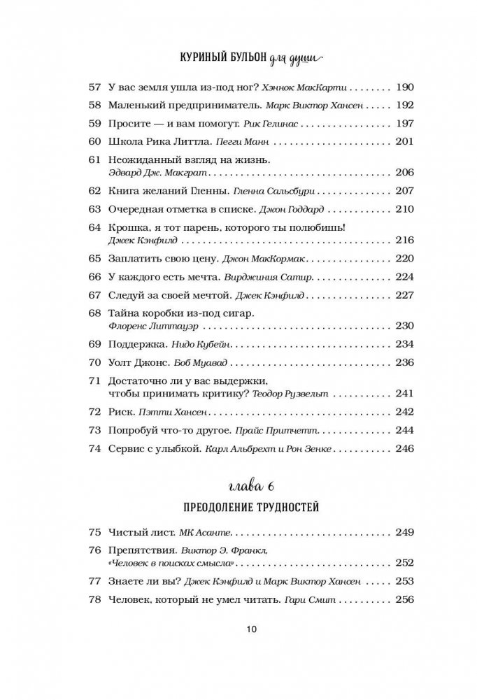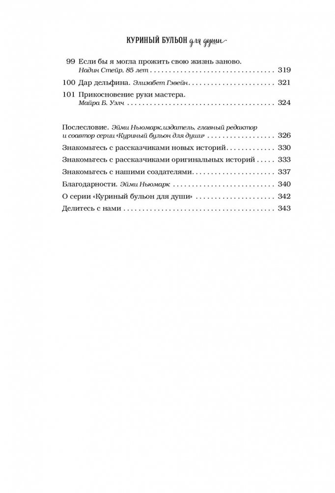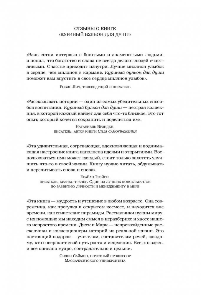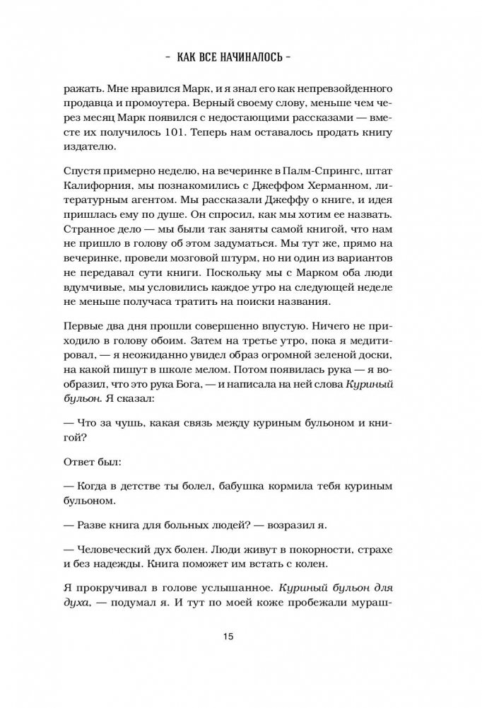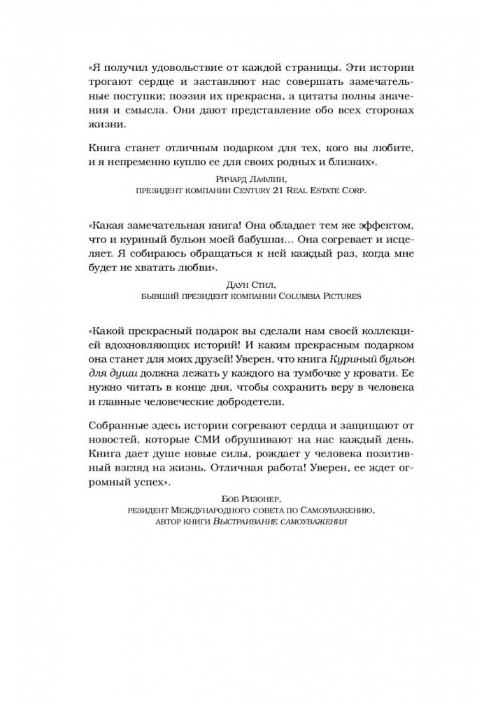 В детстве, когда вы болели, ваша бабушка давала вам куриный бульон. Сегодня питание и забота нужны вашей душе. Маленькие истории из "Куриного бульона" - исцелят душевные раны и укрепят дух, дадут вашим мечтам новые крылья и откроют секрет самого большого счастья - счастья делиться и любить. Маленький мальчик из простой семьи знакомится с тремя президентами. Мать-одиночка заводит Книгу Желаний - и все ее мечты исполняются. Неудавшаяся актриса обретает истинное счастье, узнав что у нее…. рак. Самая красивая девушка города влюбляется в горбуна после двух фраз. Учительница устраивает похороны вместо урока. 13-летняя девочка продает 45 526 коробки печенья, чтобы осуществить мамину мечту. И другие 95 поразительных историй, от которых вы не сможете оторваться.