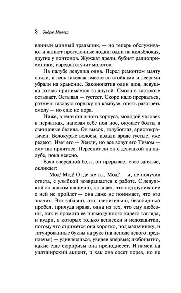 Лауреат премии Costa и финалист Букера Эндрю Миллер написал интригующий роман об одиночестве и тайне человеческой души. Мод загадочна и отстранена настолько, что всем хочется помочь ей и спасти ее потерянную душу. Тим, филолог и музыкант, тоже западает на таинственную девушку, будущего ученого, чья мечта – исследовать море и его обитателей. Тима и Мод объединяет влечение к воде: они женятся, покупают небольшую подержанную яхту, выходят в море, рожают ребенка. Но для Мод все это – брак, ребенок, медленный быт – как будто прикрытие. Она не понимает условий мира вокруг нее, а мир не понимает ее желания жить вне привычных конвенций. Когда настанет время понять границы ее внутреннего мира, Мод придется решиться на переход. Но можно ли победить одиночество еще большим одиночеством?