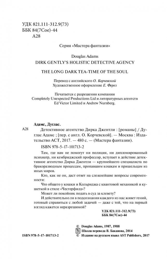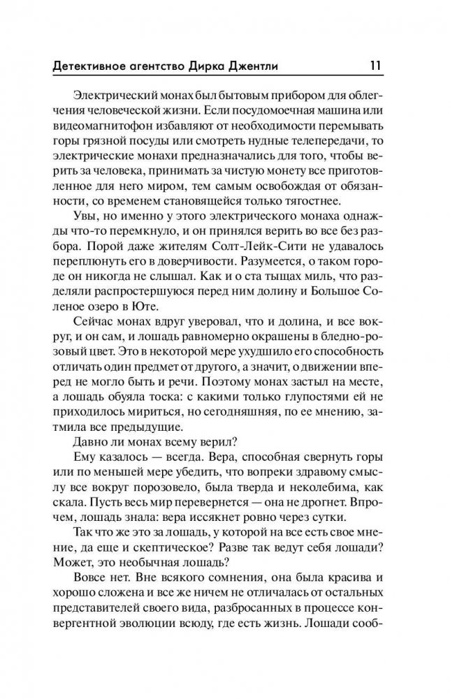 Там, где вам не помогут ни полиция, ни дипломированный психиатр, ни кембриджский профессор, вступает в действие детективное агентство Дирка Джентли – крупнейшего специалиста по бракоразводным процессам, пропавшим кошкам и пришельцам из иных миров. Кто, как не он, даст ответ на сложнейшие вопросы современности: Что общего у кошки и Кольриджа с квантовой механикой и кушеткой в стиле «Честерфилд»? Может ли покойник подать в суд за клевету? И действительно ли в подсознании каждого из нас живет гений, готовый справиться с любой задачей – даже с той, что на первый взгляд кажется неразрешимой?