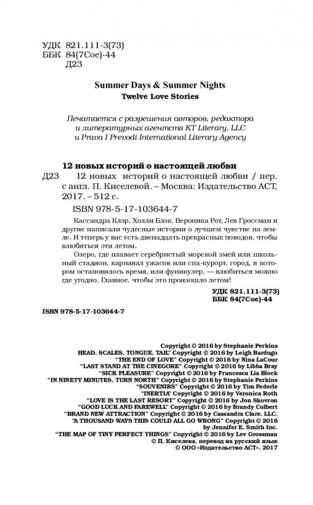 Может быть, все дело в этих длинных, ленивых днях? Может быть, из-за жары все немного сходят с ума? Как бы то ни было, лето – лучшее время для любви. Вероника Рот («Дивергент»), Кассандра Клэр («Город костей»), Холли Блэк («Холодный город»), Лев Гроссман («Волшебники») и другие написали чудесные истории о лучшем чувстве на земле. И теперь у вас есть двенадцать прекрасных поводов, чтобы влюбиться эти летом. Озеро, где плавает серебристый морской змей или школьный стадион, карнавал ужасов или спа-курорт, город, в котором остановилось время, или фуникулер, – влюбиться можно где угодно. Главное, чтобы это произошло летом!