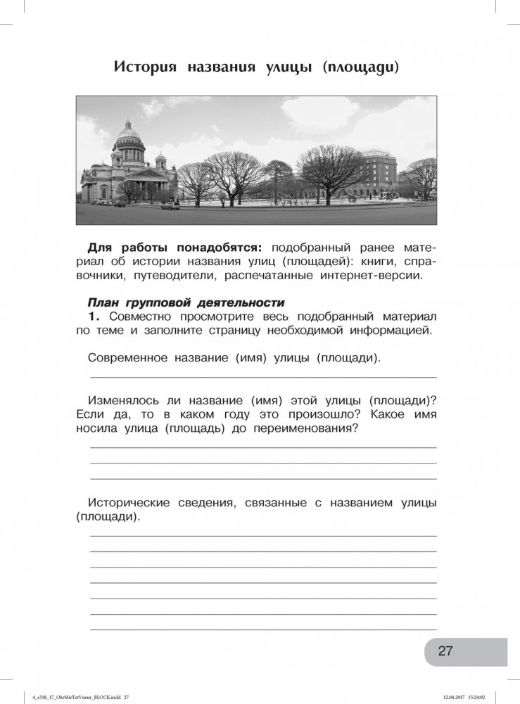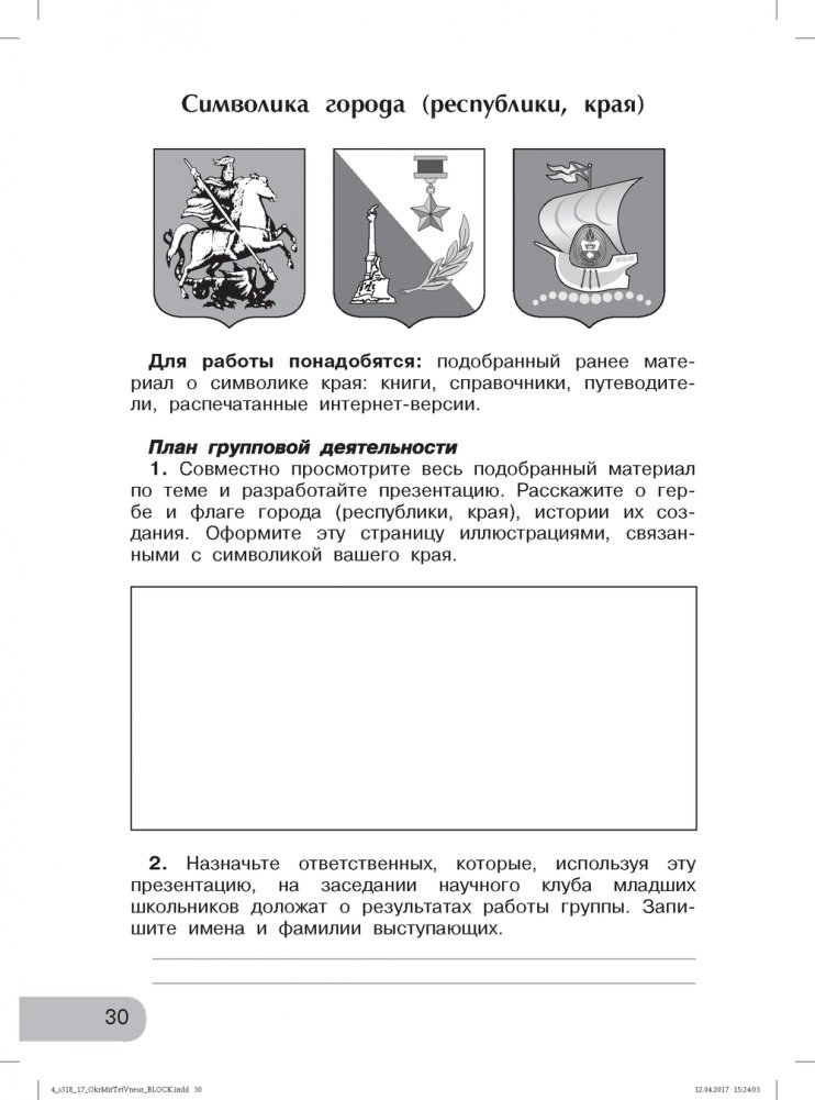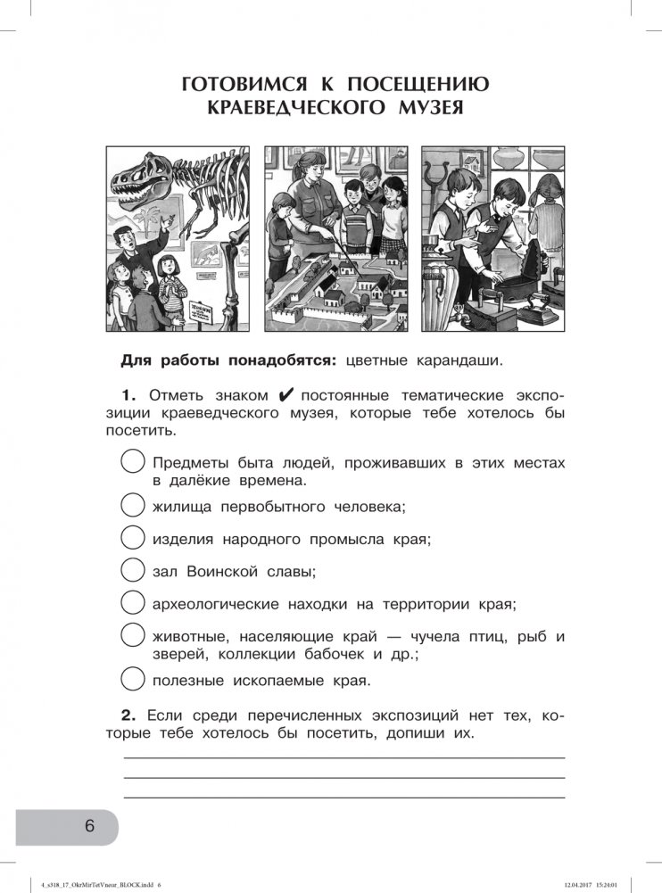 Тетрадь предназначена для организации внеурочной деятельности по учебному предмету «Окружающий мир». Представленные задания связаны с подготовкой и проведением экскурсий в краеведческий музей, городскую (областную, районную) библиотеку; формированием умений работать с картотекой библиотек; подготовкой пособия по окружающему миру «Достопримечательности родного края». Часть заданий посвящена подготовке к празднованию Дня Победы, участию в шествии «Бессмертный полк».