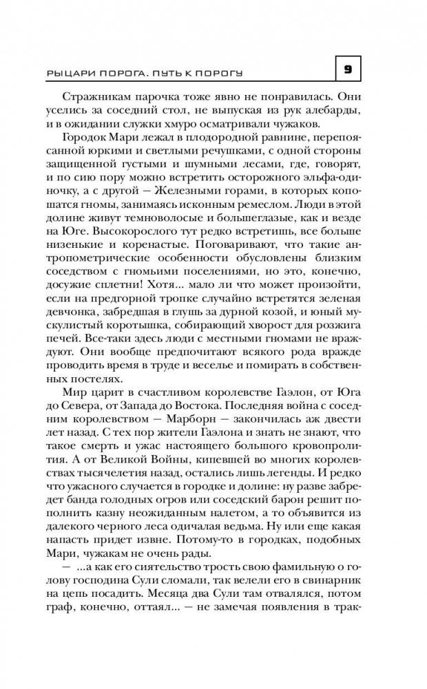 Земли, некогда опаленные Великой Войной, возрождаются. Давно исчезли следы пожарищ и крови. Королевства людей набирают силу. Казалось бы, наступает расцвет мирной жизни – гномы-ремесленники совершенствуют свое мастерство, в пустошах ведется охота, в которой нет равных полудиким оркам, а Высокий Народ чтит и хранит свои древние тайны… Но угроза приходит из страшных мест, название которым – Пороги. Оттуда, из трещин между мирами, веет смертью и разрушениями. Орды жутких существ стремятся захватить едва возродившийся мир. Кто в итоге воцарится – Человек или Тварь? Только немногие способны противостоять чужакам. Имя им – Рыцари Порога.