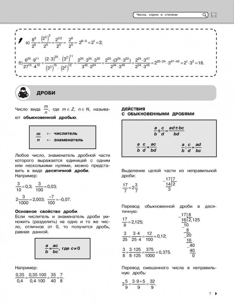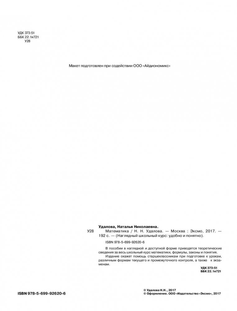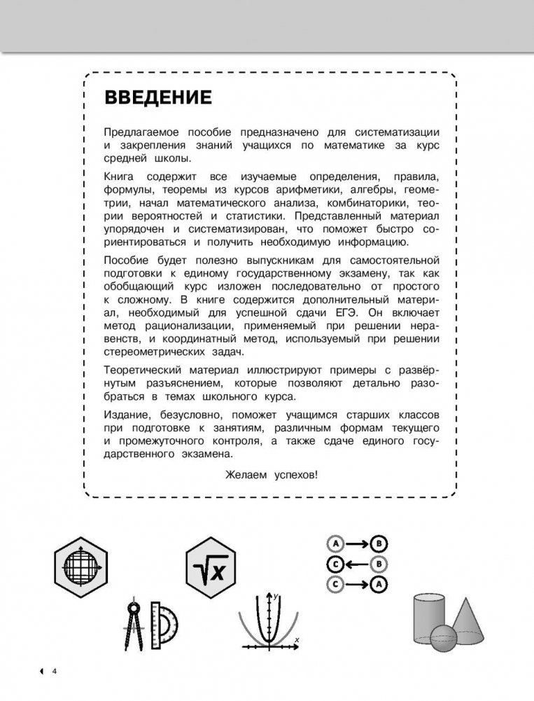 В пособии в наглядной и доступной форме приводятся теоретические сведения за весь школьный курс математики, формулы, законы и понятия. Издание окажет помощь старшеклассникам при подготовке к урокам, различным формам текущего и промежуточного контроля, а также к экзаменам.