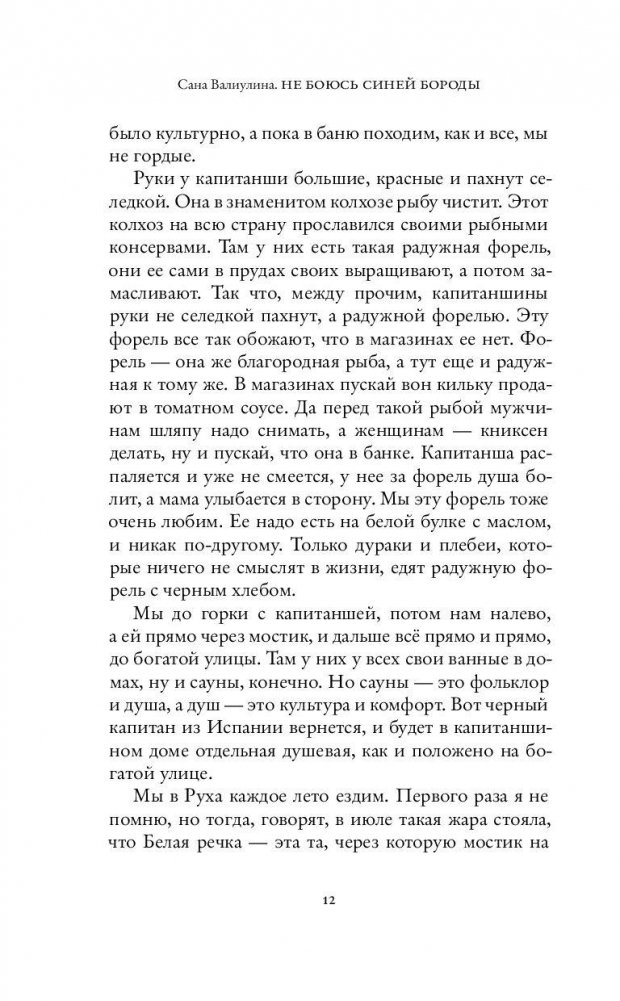 Сана Валиулина родилась в Таллинне (1964), закончила МГУ, с 1989 года живет в Амстердаме. Автор книг на голландском – автобиографического романа «Крест» (2000), сборника повестей «Ниоткуда с любовью», романа «Дидар и Фарук» (2006), номинированного на литературную премию «Libris» и переведенного на немецкий, и романа «Сто лет уюта» (2009). Новый роман «Не боюсь Синей Бороды» (2015) был написан одновременно по-голландски и по-русски. Вышедший в 2016-м сборник эссе «Зимние ливни» был удостоен престижной литературной премии «Jan Hanlo Essayprijs». Роман «Не боюсь Синей Бороды» – о поколении «детей Брежнева», чье детство и взросление пришлось на эпоху застоя, – сшит из четырех пространств, четырех времен. От ностальгически-акварельного поселка Руха на эстонском побережье в семидесятых годах, где «тишина, только сосны гудят над валунами, как антенны: море транслируют», с загадочным домом, в котором происходят таинственные происшествия, – через Таллинн рубежа семидесятых-восьмидесятых и скрытую жестокость советской школы и Таллинн начала девяностых, на заре «дикого капитализма», с жестокостью явной и неприкрытой, – к нашему времени, не-существующей стране и эпохе-без-перемен.