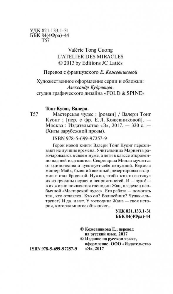 Герои новой книги Валери Тонг Куонг переживают не лучшие времена. Учительница Мариэтта разочаровалась в своем муже, а дети в классе откровенно над ней издеваются. Секретарша Милли мучается от одиночества и чувствует себя ненужной. Верзила мистер Майк, бывший военный, дезертировал из армии и стал бродягой. Нужно, чтобы кто-то вытянул их из трясины неудач и неприятностей. И — чудо! — в их жизни появляется господин Жан, владелец необычной "Мастерской чудес". Его работа — помогать тем, кто отчаялся. Кто он? Волшебник? Чудак-альтруист? И да, и нет. У господина Жана — своя история, которая многое объясняет…