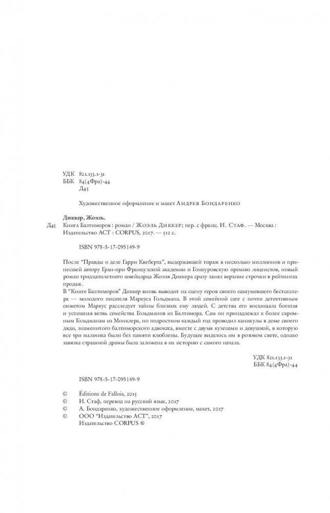 Вслед за мировым бестселлером “Правда о деле Гарри Квеберта” новый роман Жоэля Диккера сразу оказался в лидерах продаж. В этой семейной саге с почти детективным сюжетом молодой писатель Маркус Гольдман расследует тайны своей родни из Балтимора. В юности он проводил каникулы вместе с ними, своими кузенами любимой девушкой, что составляло смысл его жизни. Будущее виделось в розовых тонах, однако завязка страшной драмы была заложена в эту историю с самого начала. От автора бестселлера «Правда о деле Гарри Квеберта».