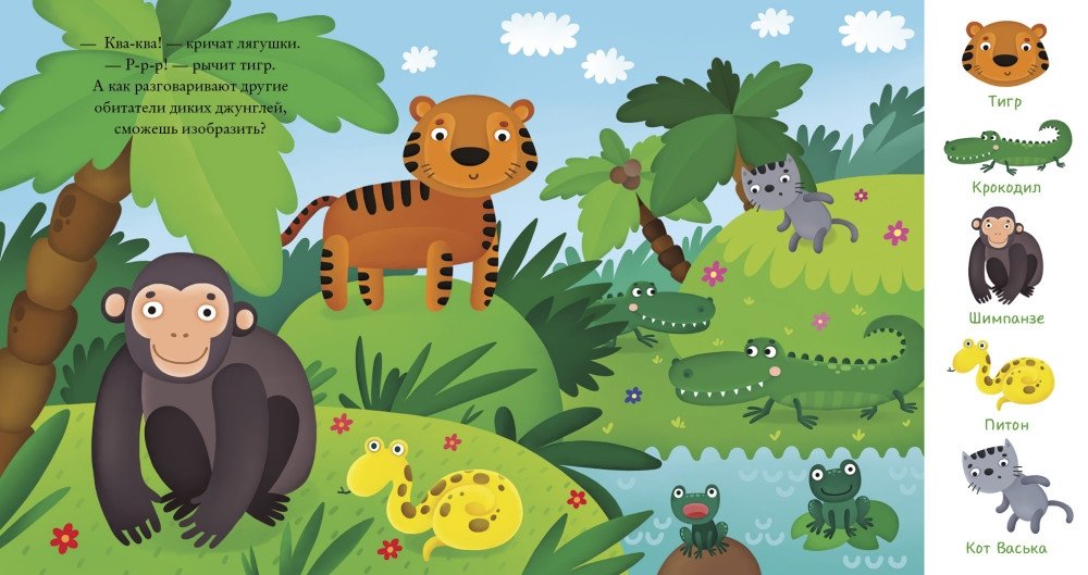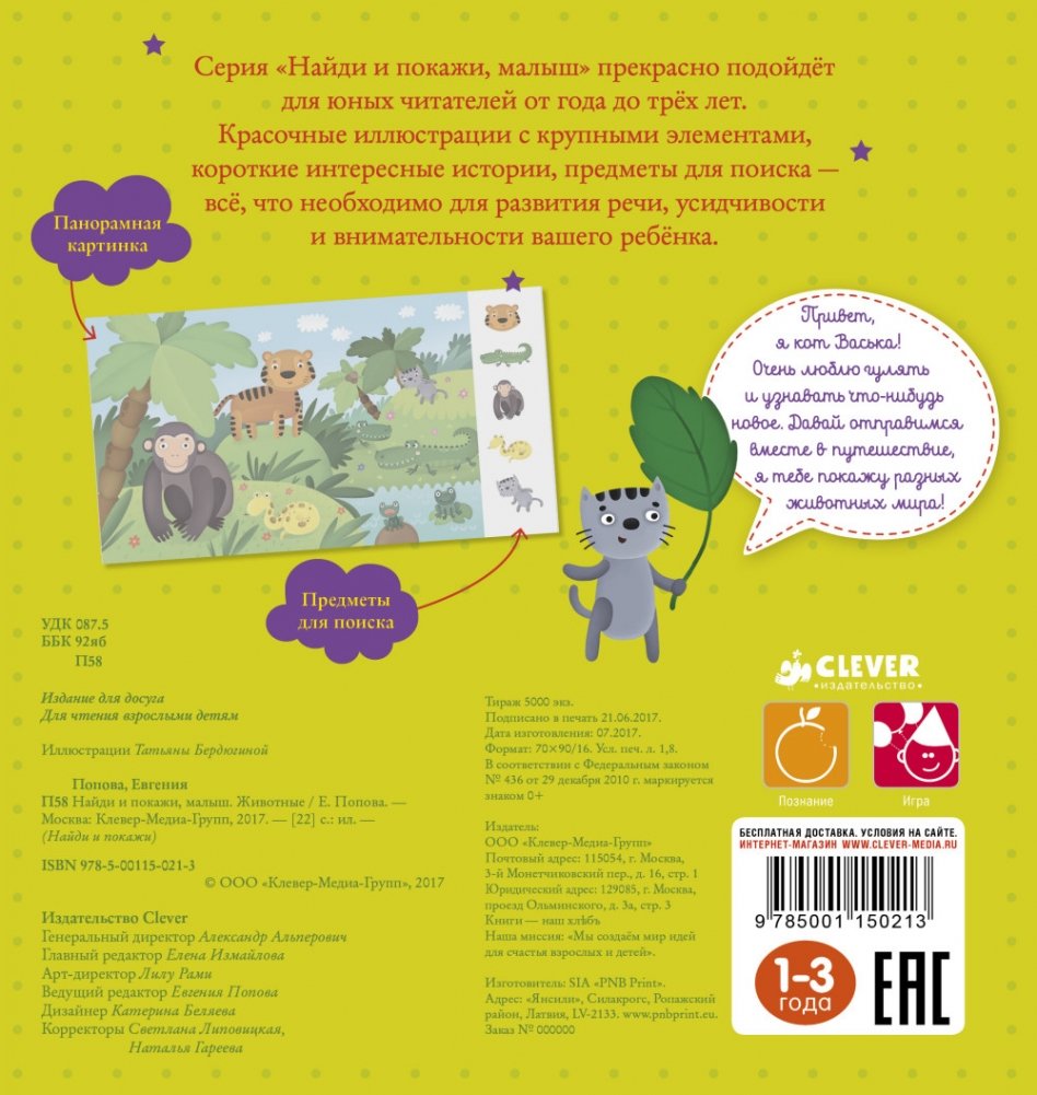 Пока ребенок рассматривает картинки и ищет предметы, он будет знакомиться с окружающим миром и узнает много интересного о зверюшках со всего мира. Красочные иллюстрации с крупными элементами, короткие интересные истории, игра «Найди и покажи» — все, что необходимо для развития речи, усидчивости и внимательности вашего ребенка. Рассматривайте вместе картинки, ищите предметы, вынесенные на край страницы, а шустрый кот Васька не даст заскучать, он будет сопровождать вас на протяжении всего путешествия. Книжку приятно брать в руки: странички плотные, а иллюстрации красочные и яркие. Вы и сами будете с удовольствием рассматривать книгу. Ведь самое важное — ваши совместные занятия с малышом.