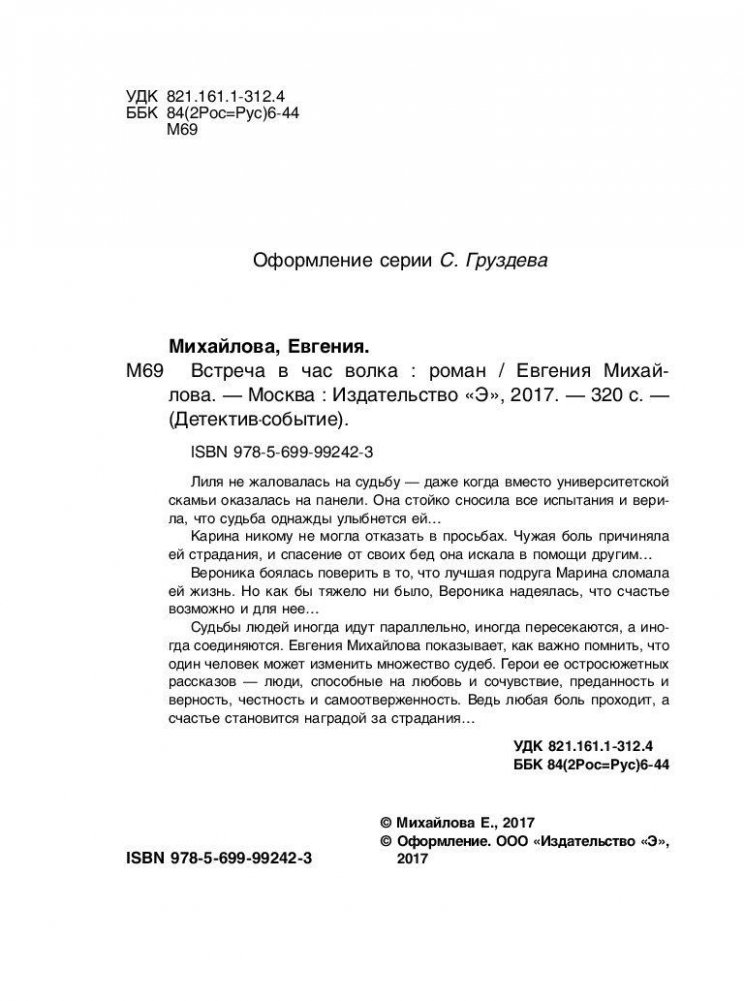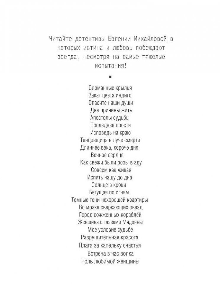 Лиля не жаловалась на судьбу — даже когда вместо университетской скамьи оказалась на панели. Она стойко сносила все испытания и верила, что судьба однажды улыбнется ей… Карина никому не могла отказать в просьбах. Чужая боль причиняла ей страдания, и спасение от своих бед она искала в помощи другим… Вероника боялась поверить в то, что лучшая подруга Марина сломала ей жизнь. Но как бы тяжело ни было, Вероника надеялась, что счастье возможно и для нее… Судьбы людей иногда идут параллельно, иногда пересекаются, а иногда соединяются. Евгения Михайлова показывает, как важно помнить, что один человек может изменить множество судеб. Герои ее остросюжетных рассказов — люди, способные на любовь и сочувствие, преданность и верность, честность и самоотверженность. Ведь любая боль проходит, а счастье становится наградой за страдания…