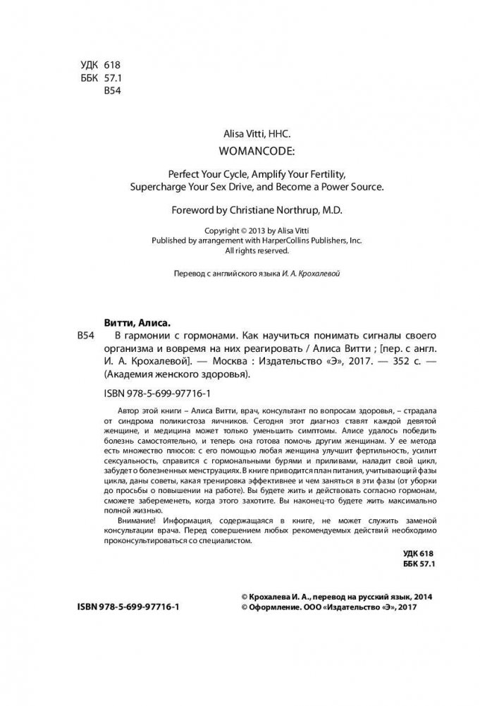 Автор этой книги – Алиса Витти, врач, консультант по вопросам здоровья, – страдала от синдрома поликистоза яичников. Сегодня этот диагноз ставят каждой девятой женщине, и медицина может только уменьшить симптомы. Алисе удалось победить болезнь самостоятельно, и теперь она готова помочь другим женщинам. У ее метода есть множество плюсов: с его помощью любая женщина улучшит фертильность, усилит сексуальность, справится с гормональными бурями и приливами, наладит свой цикл, забудет о болезненных менструациях. В книге приводится план питания, учитывающий фазы цикла, даны советы, какая тренировка эффективнее и чем заняться в эти фазы (от уборки до просьбы о повышении на работе). Вы будете жить и действовать согласно гормонам, сможете забеременеть, когда этого захотите. Вы наконец-то будете жить максимально полной жизнью. Внимание! Информация, содержащаяся в книге, не может служить заменой консультации врача. Перед совершением любых рекомендуемых действий необходимо проконсультироваться со специалистом.