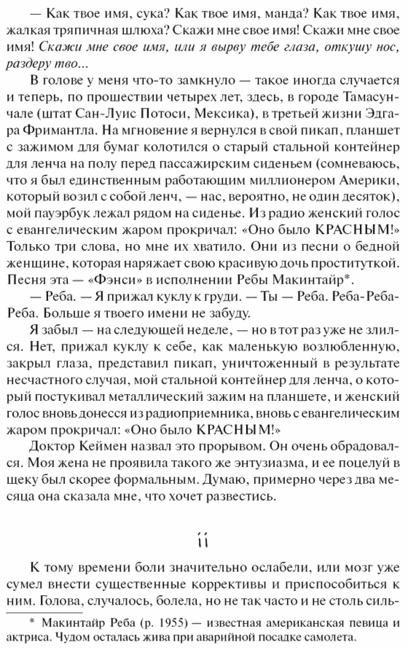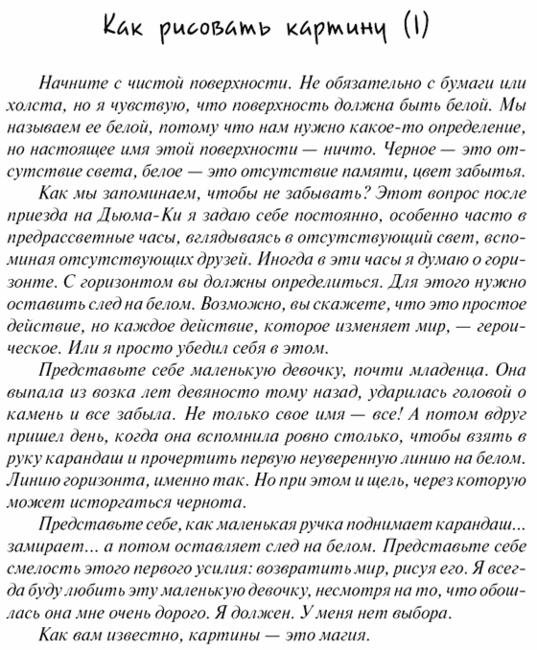 Маленький южный островок Дьюма-Ки — идеальное пристанище для человека, который пытается начать все сначала. Так по крайней мере считает некогда преуспевающий бизнесмен, который стал инвалидом в результате несчастного случая — но зато обрел талант потрясающего художника. Однако чем дольше живет он на Дьюма-Ки, тем более страшную силу обретают его картины. В них таится Зло. Но что это за Зло?