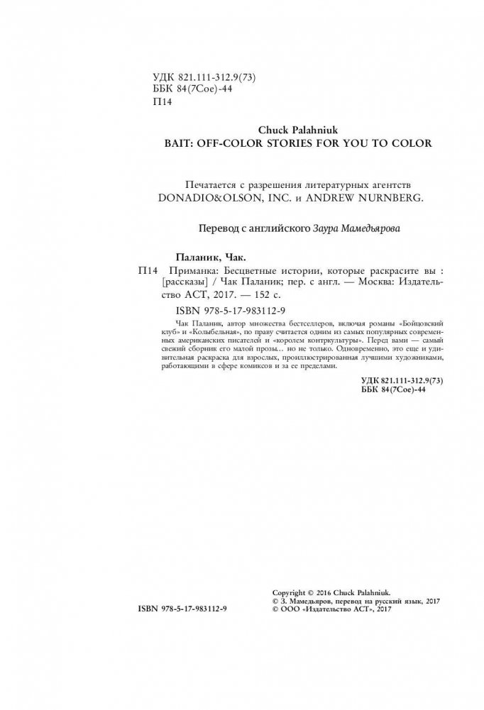 Чак Паланик, автор множества бестселлеров, включая романы «Бойцовский клуб» и «Колыбельная», по праву считается одним из самых популярных современных американских писателей и «королем контркультуры». Перед вами — самый свежий сборник его малой прозы… но не только. Одновременно, это еще и удивительная раскраска для взрослых, проиллюстрированная лучшими художниками, работающих в сфере комиксов и за ее пределами.