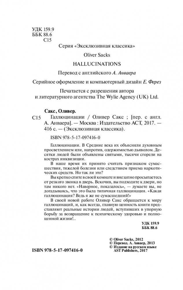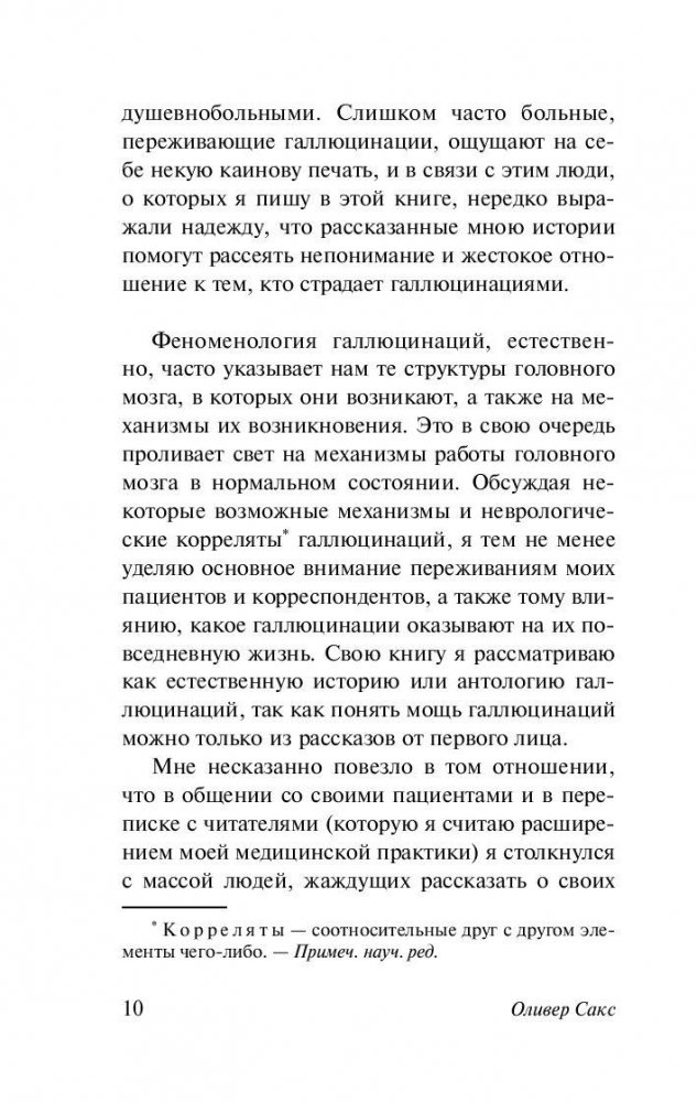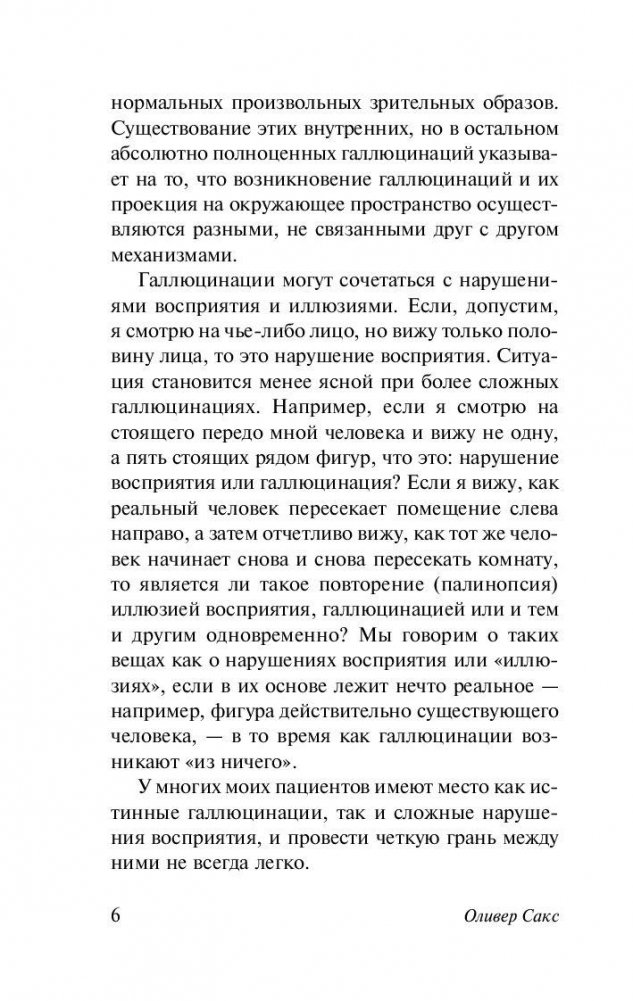 В Средние века их объясняли духовным просветлением или, напротив, одержимостью дьяволом. Десятки людей были объявлены святыми, тысячи сгорели на кострах инквизиции. В наше время их принято считать признаком сумасшествия, тяжелой болезни или следствием приема наркотических средств. Но так ли это? Вы крепко спите в своей комнате и внезапно просыпаетесь от резкого звонка в дверь. Вскочив, вы подходите к двери, но там никого нет. "Наверное, показалось", — думаете вы, не догадываясь, что это была типичная галлюцинация. "Какая галлюцинация? Ведь я же не сумасшедший!" В своей новой работе Оливер Сакс обращается к миру галлюцинаций, и, как всегда, главную ценность книги представляют реальные истории людей, вступивших в упорную борьбу за возвращение к психическому здоровью и полноценной жизни!