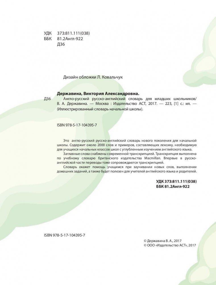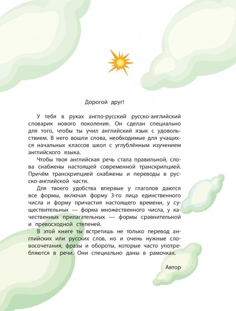 Это англо-русский русско-английский словарь нового поколения для начальной школы. Содержит около 2000 слов и примеров, составляющих лексику, необходимую для учащихся начальных классов школ с углубленным изучением английского языка. Заглавные слова снабжены современной транскрипцией. Транскрипция выполнена по учебному словарю британского издательства Macmillan. Впервые в русско-английской части переводы тоже сопровождаются транскрипцией. Словарь окажет помощь учащимся при заучивании новых слов, выполнении домашних заданий, а также будет полезен для учителей английского языка и родителей.