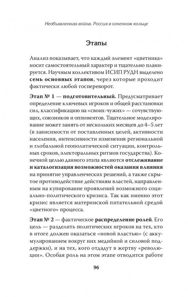 Устранив в конце XX века с мировой арены своего главного геополитического конкурента — СССР, американская элита периода холодной войны двигалась по инерции, то есть продолжая борьбу с «красной угрозой» даже после ее «устранения». Заточенная на противостояние политическая механика западного мира не могла действовать иначе. Те же люди и те же геополитические условия. Все это наложилось на совершенно нормальную в рамках мировой хозяйственной системы конкуренцию за рынки и ресурсы. Остановки или перерыва в этом движении не будет. Технологии государственных переворотов, осуществляемых США в разных странах мира, совершенствуются день ото дня. Главной же мишенью для Америки так же, как и в 90-е годы, является наша страна. Тогда зарубежным «друзьям» с помощью нашей продажной элиты удалось развалить самое большое государство в мире — СССР. Сегодня Россия, в буквальном смысле слова, находится во всеоружии. Но и Запад не дремлет. Работа с оппозицией, попытки организовать протестное движение в крупных городах России провалились, и западные политтехнологи перенесли свою активность в регионы РФ. Их цель — отколоть от России куски, развалить ее на части, как когда-то был развален Советский Союз. Дмитрий Егорченков — политолог, директор Института стратегических исследований и прогнозов (ИСИП) РУДН. С 2002 по 2008 гг. на дипломатической работе в Ираке, Алжире, центральном аппарате МИД России.