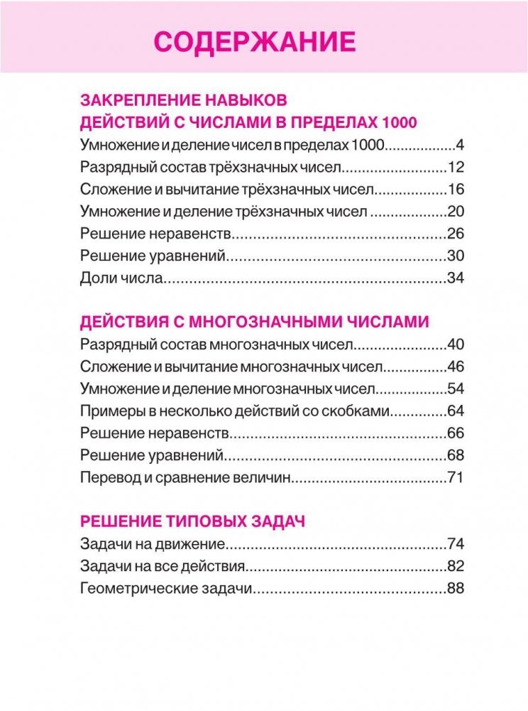 Тренажёр закрепляет навыки всех действий с многозначными числами, включая решение сложных примеров со скобками и без. Благодаря упражнениям совершенствуются навыки решения неравенств и уравнений, а также отрабатываются алгоритмы решения текстовых задач и задач на геометрические построения. Задания, распределённые по темам в порядке их изучения, позволяют развить и закрепить знания и навыки, полученные на уроках, а также дают возможность дополнительных занятий по каждой теме и глубокого понимания смысла учебного материала. Упражнения логично вписываются как в школьную программу, так и в методики домашних занятий. Пособие идеально для подготовки к итоговым, проверочным и тестовым заданиям и чрезвычайно удобно для домашнего обучения.