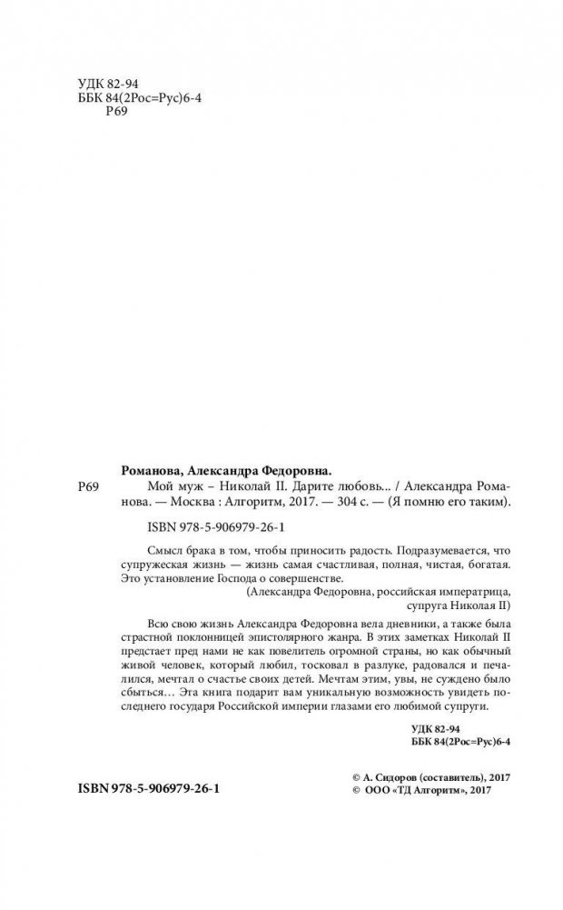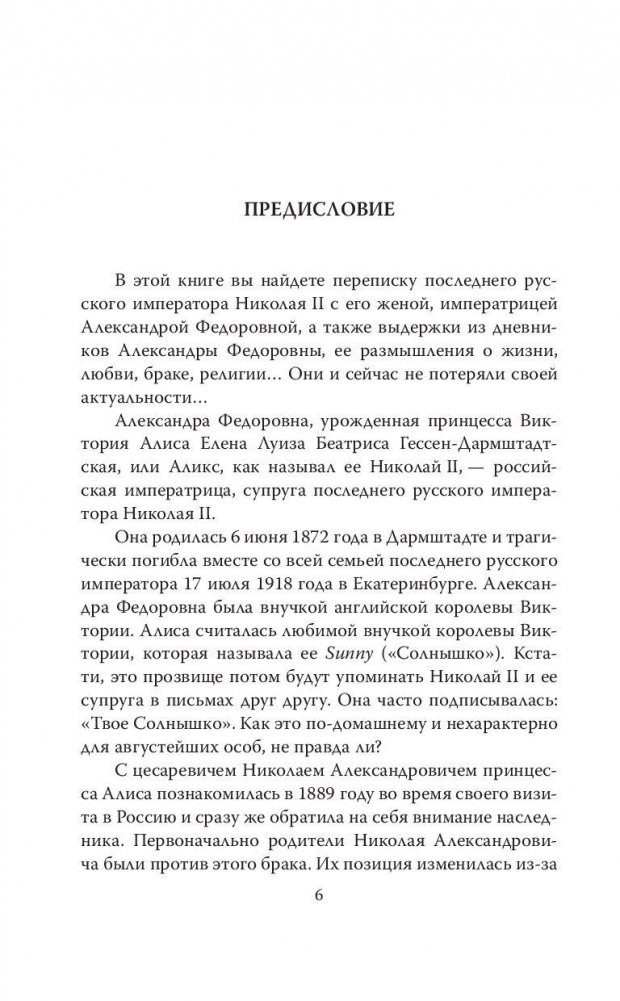 Смысл брака в том, чтобы приносить радость. Подразумевается, что супружеская жизнь — жизнь самая счастливая, полная, чистая, богатая. Это установление Господа о совершенстве. (Александра Федоровна, российская императрица, супруга Николая II). Всю свою жизнь Александра Федоровна вела дневники, а также была страстной поклонницей эпистолярного жанра. В этих заметках Николай II предстает пред нами не как повелитель огромной страны, но как обычный живой человек, который любил, тосковал в разлуке, радовался и печалился, мечтал о счастье своих детей. Мечтам этим, увы, не суждено было сбыться… Эта книга подарит вам уникальную возможность увидеть последнего государя Российской Империи глазами его любимой супруги.