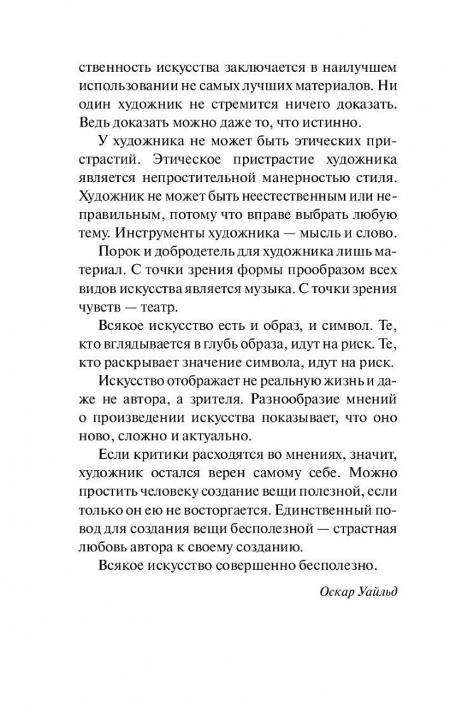 "Портрет Дориана Грея" — самое знаменитое произведение Оскара Уайльда, единственный его роман, вызвавший в свое время шквал негативных оценок и тем не менее имевший невероятный успех. Главный герой романа, красавец Дориан, — фигура двойственная, неоднозначная. Тонкий эстет и романтик становится безжалостным преступником. Попытка сохранить свою необычайную красоту и молодость оборачивается провалом. Вместо героя стареет его портрет — но это не может продолжаться вечно, и смерть Дориана расставляет все по своим местам. Роман Оскара Уайльда продолжает быть очень актуальным и сегодня — разве погоня за вечной молодостью порой не оборачивается потерей своего истинного лица?