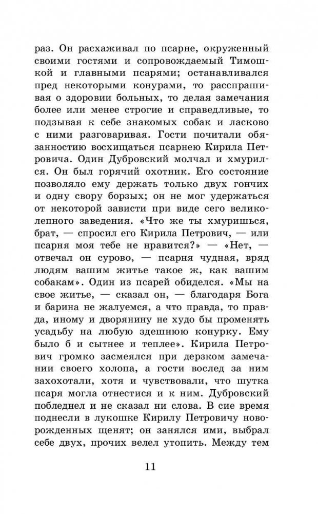 В книгу вошли два выдающихся произведения Александра Сергеевича Пушкина (1799–1837): роман «Дубровский» и «Повести Белкина». Главный герой романа «Дубровский» (1833) – Владимир Дубровский – благородный разбойник. Судьба заставила его встать на преступный путь: он был несправедливо осуждён властями за поджог и убийство. Дубровский жаждет отомстить своему врагу – сумасбродному помещику Кириллу Троекурову, который довёл его отца до смерти и дал ложные показания на Дубровского в суде. Владимир нанимается в дом Троекурова под видом гувернёра. Однако его планам не суждено сбыться: неожиданно он влюбляется в дочь Троекурова – Машу… «Повести покойного Ивана Петровича Белкина» (1831) состоят из 5 повестей: «Выстрел», «Метель», «Гробовщик», «Станционный смотритель» и «Барышня-крестьянка». Все они являются образцами различных литературных стилей: это и реализм, и сентиментализм, и готическая повесть, и даже водевиль. «Повести Белкина» – уникальное произведение русской литературы XIX века, открывшее новые горизонты творческого развития для многих известных писателей.