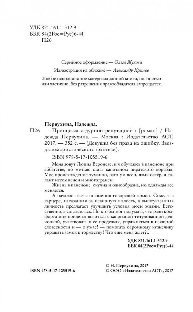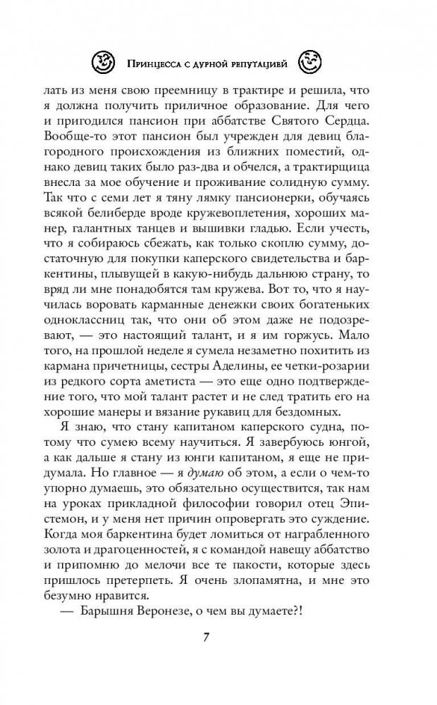 Меня зовут Люция Веронезе, и я обучаюсь в пансионе при аббатстве, но мечтаю стать капитаном пиратского корабля. Мое происхождение туманно, зато ум ясен, язык остер, а талант несомненен и многогранен. Жизнь в пансионе скучна и однообразна, но однажды все меняется. А началось все с появления говорящей крысы. Сижу я в карцере, наказанная за невинную шалость, а вышеуказанная личность предлагает улучшить условия моей жизни. Естественно, я согласилась. Но кто бы мог подумать, что ради комфорта мне придется возиться с капризной титулованной девчонкой, участвовать в ее проделках, упражняться в изящной словесности и – о ужас! – помогать огромному кузнечику украшать замок к торжеству! Что еще меня ждет?