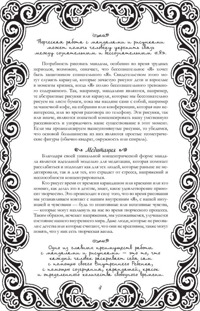 Известный философ Джозеф Мэрфи сравнивал человеческое подсознание с садом, а человека – с садовником. Что человек посеет в своем саду-подсознании, то и получит. Ведь давно известно, что мысль материальна. Перестаньте отравлять свое подсознание и начните питать его созидательными, благотворными идеями и мыслями, жизнеутверждающими образами. Раскрашивая рисунки и мандалы в свои любимые цвета, вы тем самым визуализируете свои желания и мечты, которые непременно сбудутся. Это отличное хобби и антистресс-терапия!