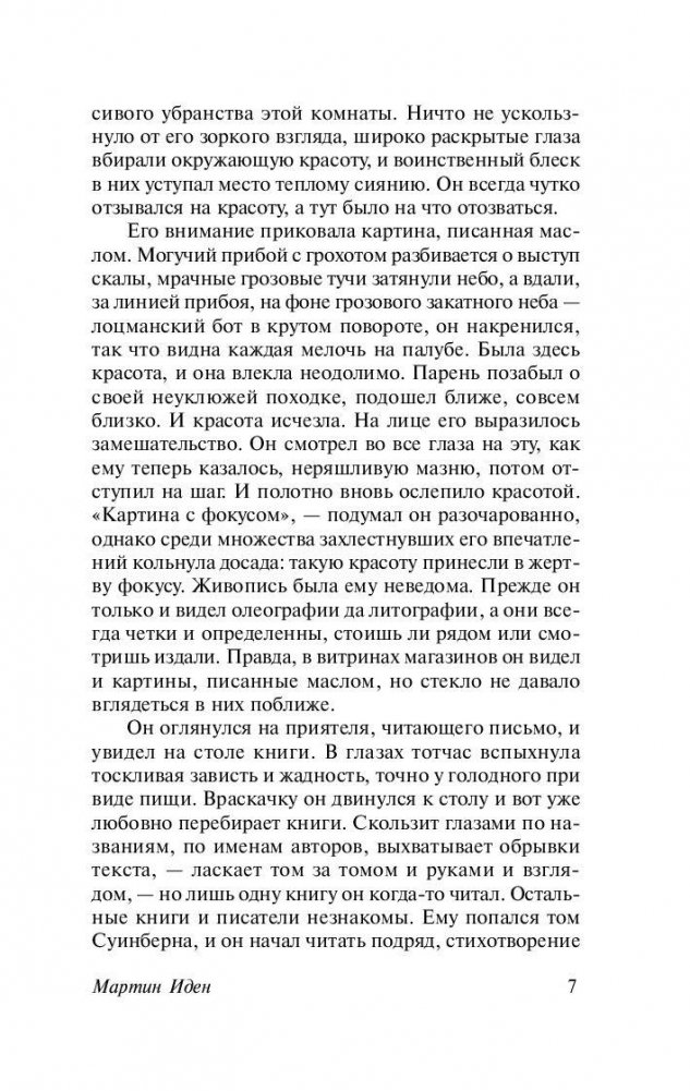 «Мартин Иден» – самый известный роман Джека Лондона, впервые напечатанный в 1908 – 1909 гг. Во многом автобиографическая книга о человеке, который «сделал себя сам», выбравшись из самых низов, добился признания. Любовь к девушке из высшего общества побуждает героя заняться самообразованием. Он становится писателем, но все издательства отказывают ему в публикации. И как это часто бывает в жизни, пройдя сквозь лишения и унижения, получив отказ от любимой девушки, он наконец становится знаменитым. Но ни слава, ни деньги, ни успех, ни даже возвращение его возлюбленной не могут уберечь Мартина от разочарования в этой насквозь фальшивой жизни.