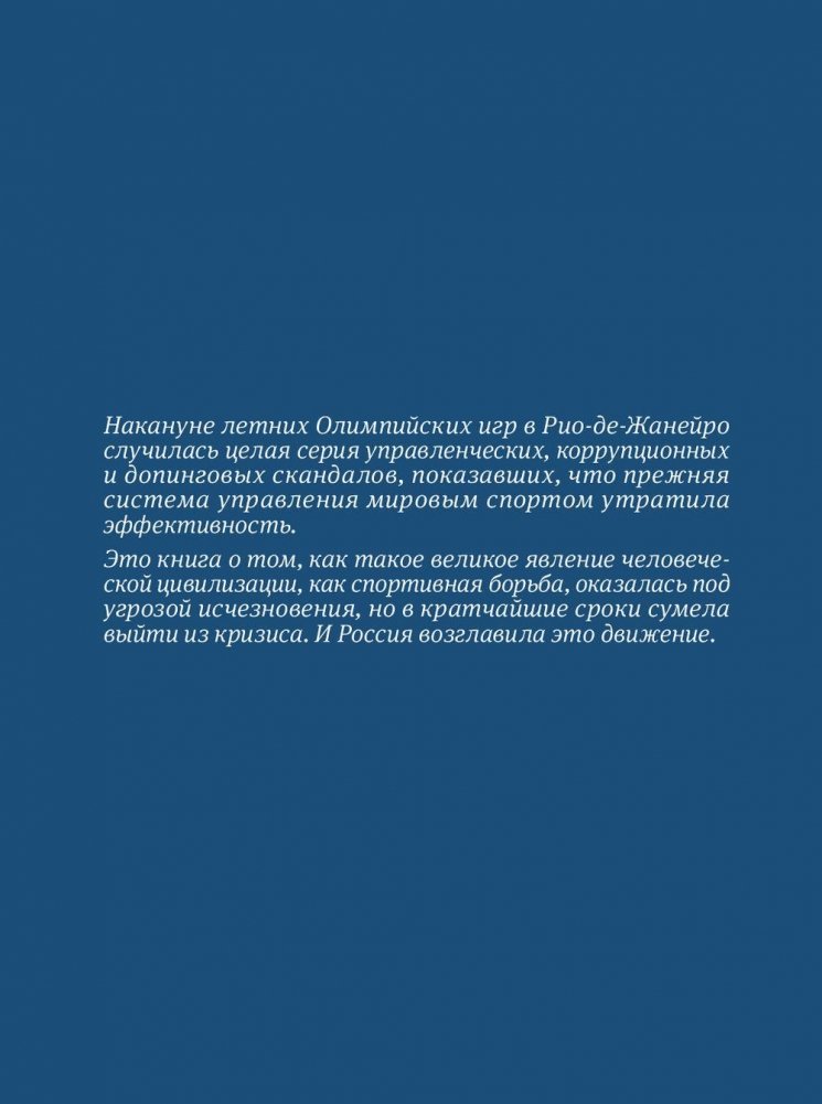 Накануне летних Олимпийских игр в Рио-де-Жанейро случилась целая серия управленческих, коррупционных и допинговых скандалов, показавших, что прежняя система управления мировым спортом утратила эффективность. Эта книга о том, как такое великое явление человеческой цивилизации, как спортивная борьба, оказалась под угрозой исчезновения, но в кратчайшие сроки сумела выйти из кризиса. И Россия возглавила это движение.