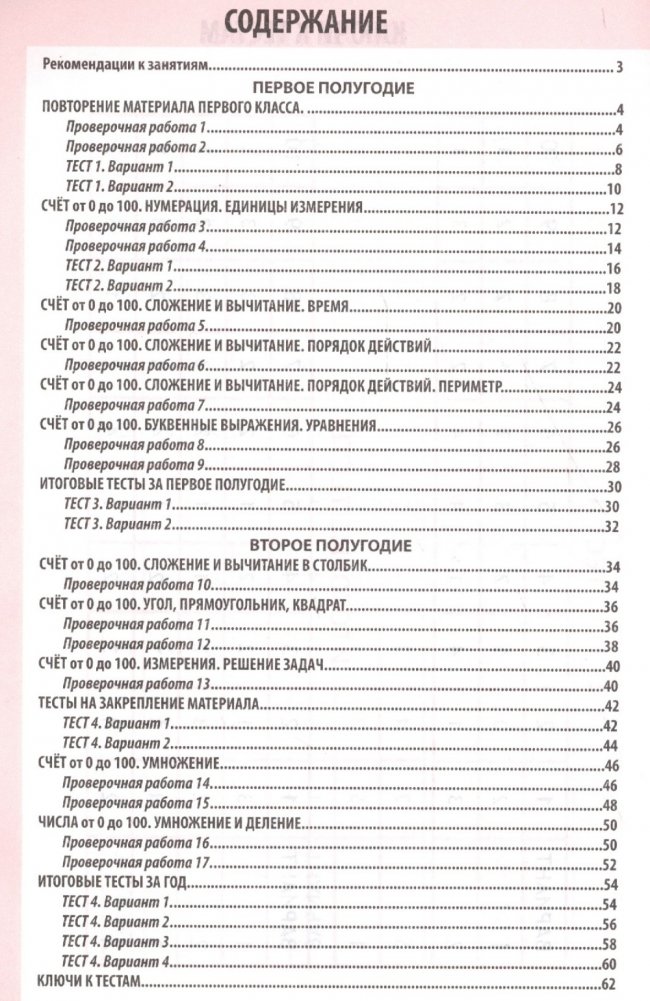 Сборник содержит полный комплект тематических, промежуточных и итоговых проверочных работ и тестовых заданий для учащихся 2 класса по математике. Материал составлен в соответствии с программой обучения по всем учебникам, рекомендованным для начальной школы. Пособие предназначено для подготовки к проверочным и тестовым заданиям в процессе школьного и домашнего обучения и ценно прежде всего возможностью для ученика заниматься и оценивать свои знания самостоятельно. Сборник, по сути, является тренажёром для итоговой аттестации по математике для школ любого уровня, а также при домашнем, дистанционном обучении и экстернате.