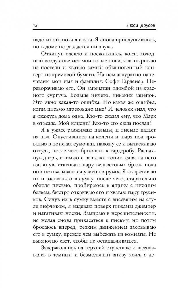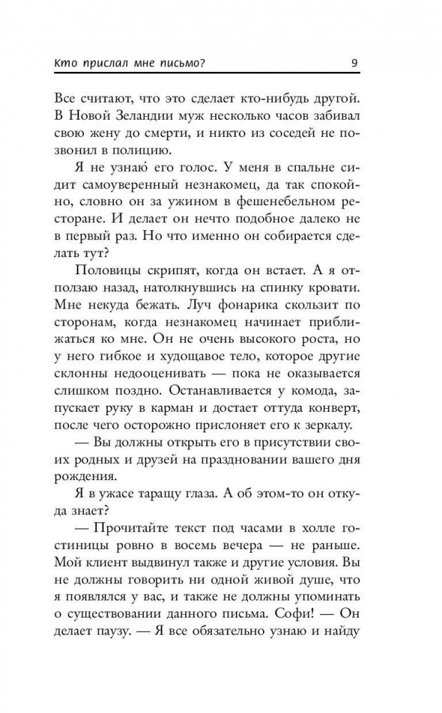 Завтра Софи исполнится 40 лет. Однако она во многом до сих пор ведет себя как девочка: отправляясь спать одна, оставляет включенным свет в ванной и ложится так, чтобы видеть открытой дверь. В ночь накануне своего юбилея Софи внезапно просыпается в полнейшей темноте и с ужасом обнаруживает прямо напротив кровати незнакомого человека. Он достает из кармана письмо и велит Софи вскрыть его в присутствии всех родных и друзей на праздновании своего дня рождения, ровно в восемь вечера. Иначе ее матери и сестрам грозит смертельная опасность! Мужчина исчезает так же внезапно, как и появился, а Софи охватывает настоящая паника. Может, это какая-то ошибка? Но на письме с безликой пломбой из красного сургуча напечатано ее имя, а незнакомец явно не шутил по поводу угрозы. И значит, ей придется выполнить его условие…