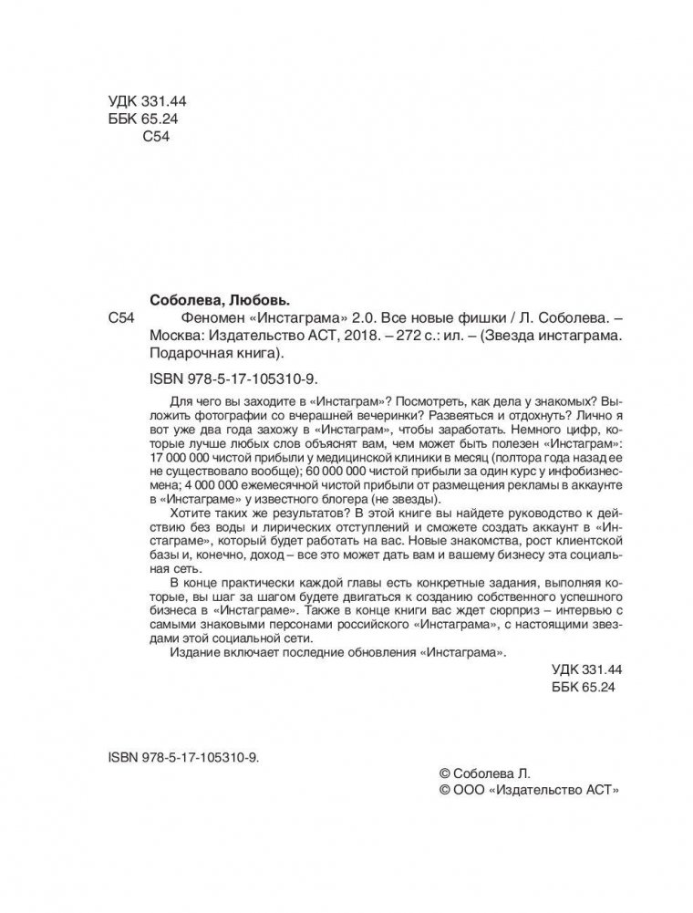 Для чего вы заходите в «Инстаграм»? Посмотреть, как дела у знакомых? Выложить фотографии со вчерашней вечеринки? Развеяться и отдохнуть? Лично я вот уже два года захожу в «Инстаграм», чтобы заработать. Немного цифр, которые лучше любых слов объяснят вам, чем может быть полезен «Инстаграм»: -17 000 000 чистой прибыли у медицинской клиники в месяц (полтора года назад ее не существовало вообще); -60 000 000 чистой прибыли за один курс у инфобизнесмена; -4 000 000 ежемесячной чистой прибыли от размещения рекламы в аккаунте в «Инстаграме» у известного блогера (не звезды).Хотите таких же результатов? В этой книге вы найдете руководство к действию без воды и лирических отступлений и сможете создать аккаунт в «Инстаграме», который будет работать на вас. Новые знакомства, рост клиентской базы и, конечно, доход – все это может дать вам и вашему бизнесу эта социальная сеть. Для того чтобы эта книга была для вас максимально эффективным навигатором по «Инстаграму», в конце практически каждой главы есть конкретные задания, выполняя которые, вы шаг за шагом будете двигаться к созданию собственного успешного бизнеса в «Инстаграме». Также в конце книги вас ждет сюрприз – интервью с самыми знаковыми персонами российского «Инстаграма», с настоящими звездами этой социальной сети. Уверена, их рассуждения об «Инстаграме» послужат вам отличной мотивацией и приоткроют дверь в этот интересный и перспективный мир!