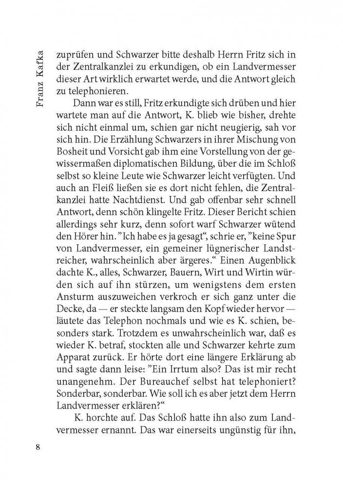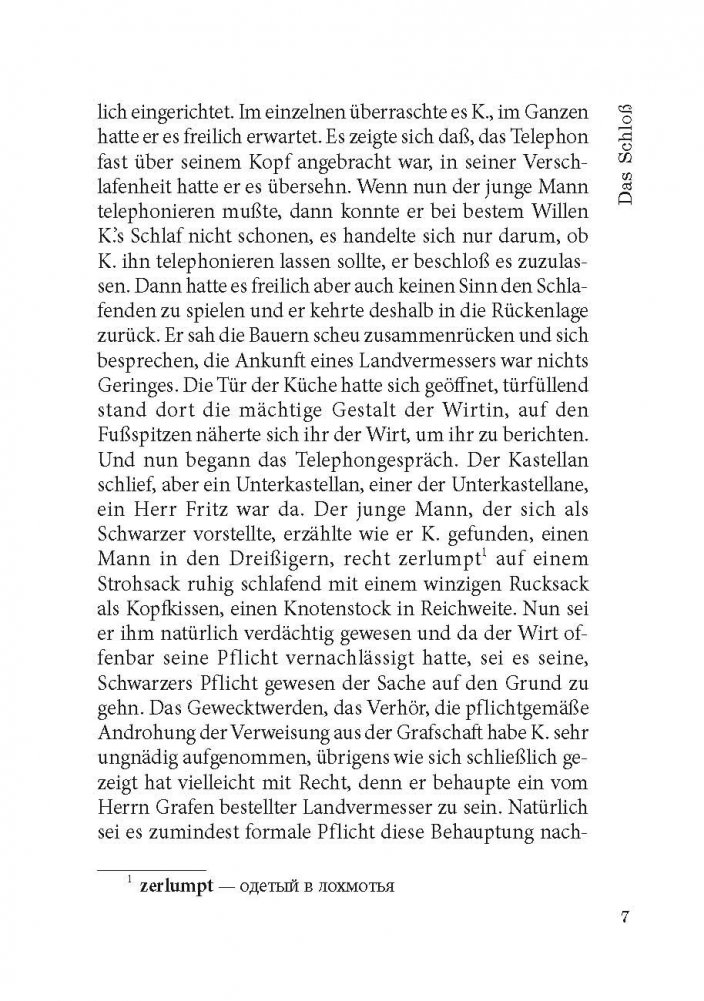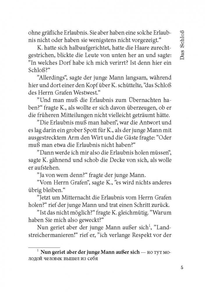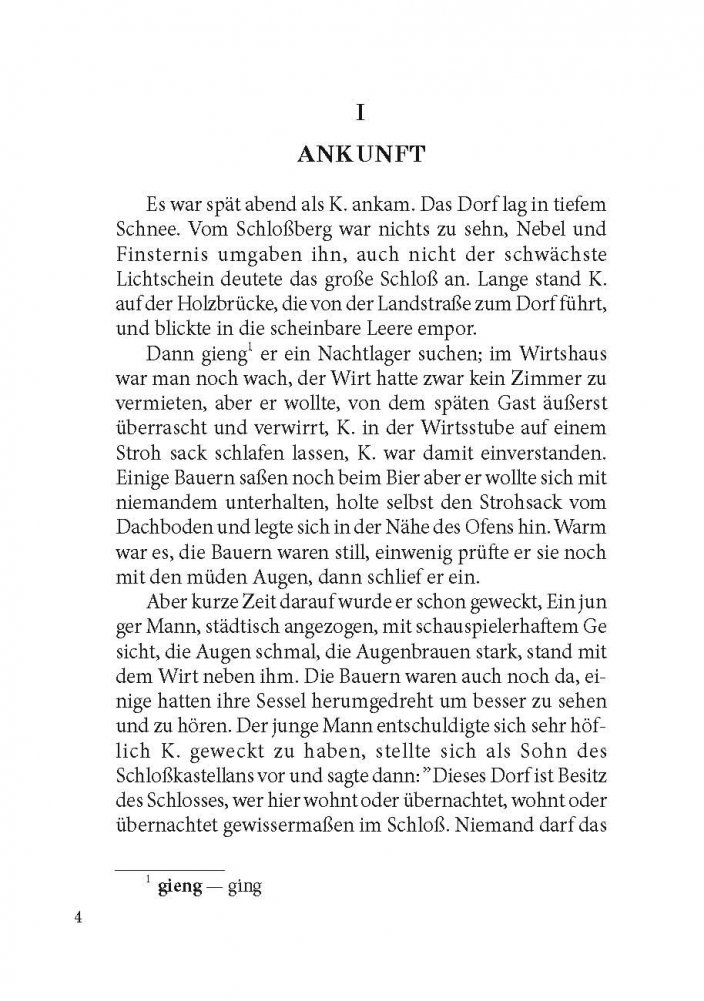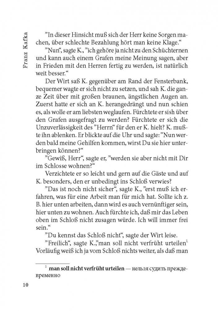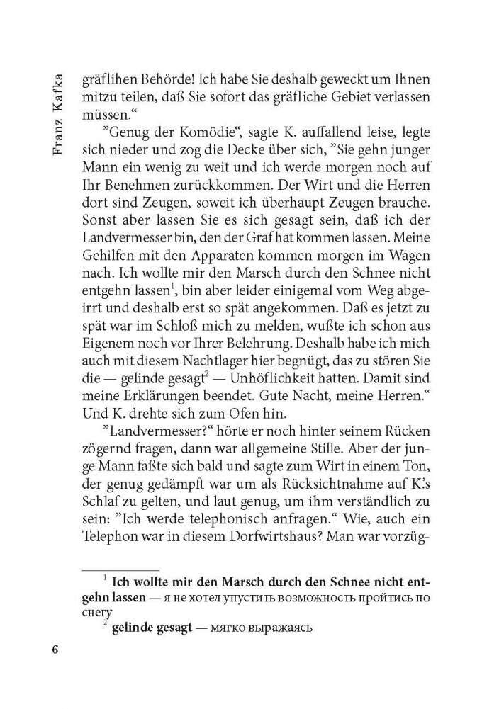 Франц Кафка (1883-1924) - один из крупнейших немецкоязычных писателей XX века. Его произведения, пронизанные абсурдом и страхом перед внешним миром и высшим авторитетом и способные пробуждать в читателе соответствующие тревожные чувства, - явление уникальное в мировой литературе. При жизни Кафка опубликовал всего четыре сборника рассказов, составивших очень малую долю его работ. Перед смертью он поручил своему другу и литературному душеприказчику Максу Броду сжечь без исключения всё им написанное, но Макс Брод не подчинился воле покойного и, таким образом, главные его творения - романы «Америка» (1911-1916), «Процесс» (1914-1918) и «Замок» (1921-1922), в разной степени незавершенные, увидели свет уже после смерти автора. Предлагаем вниманию читателей неадаптированный текст романа Ф. Кафки «Замок», снабженный комментариями и словарем.