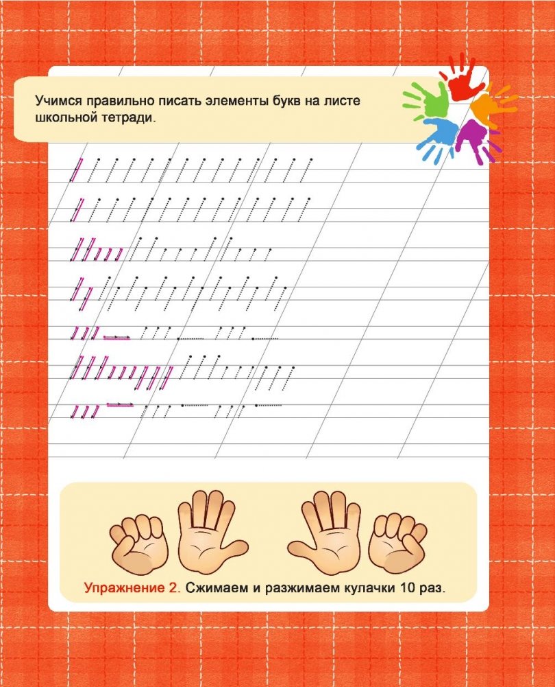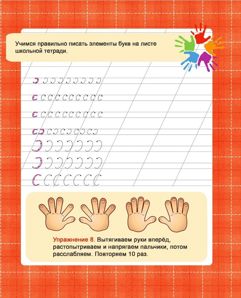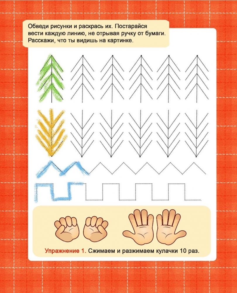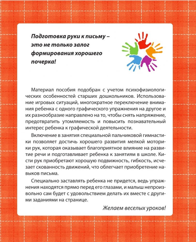Материал пособия подобран с учетом психофизиологических особенностей старших дошкольников. Использование игровых ситуаций, многократное переключение внимания ребенка с одного графического упражнения на другое и их разнообразие направлено на то, чтобы снять напряжение, предотвратить утомляемость и повысить познавательный интерес ребенка к графической деятельности. Включение в занятия специальной пальчиковой гимнастики позволяет достичь хорошего развития мелкой моторики рук, которая оказывает благоприятное влияние на развитие речи и подготавливает ребенка к занятиям в школе. Кисти рук приобретают хорошую подвижность, гибкость, исчезает скованность движений, что облегчает приобретение навыков письма. Специально заставлять ребенка не придется, ведь упражнения находятся прямо перед его глазами, и малыш непроизвольно сам будет с удовольствием делать их вместе с другими заданиями на странице.