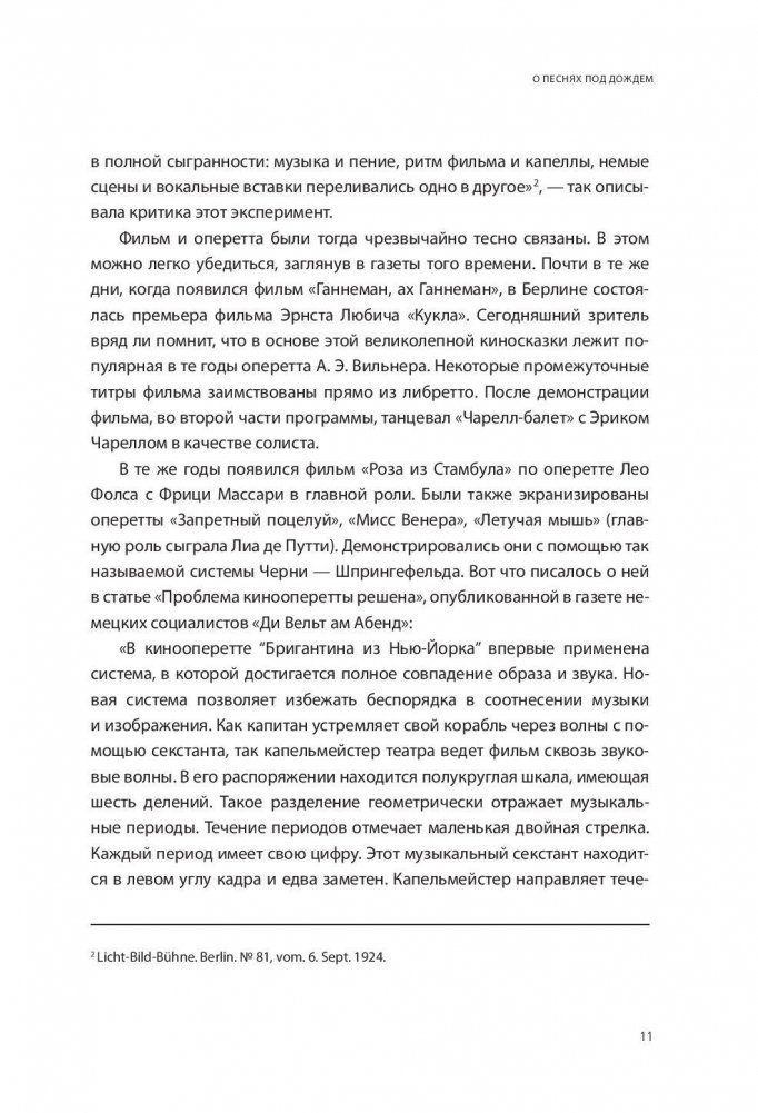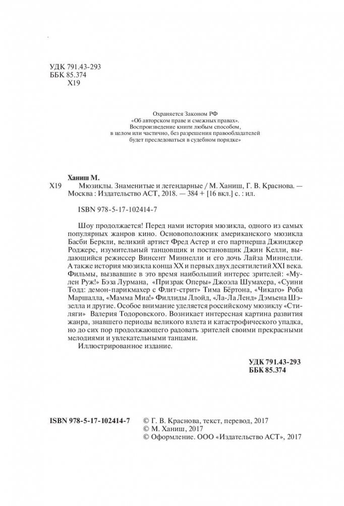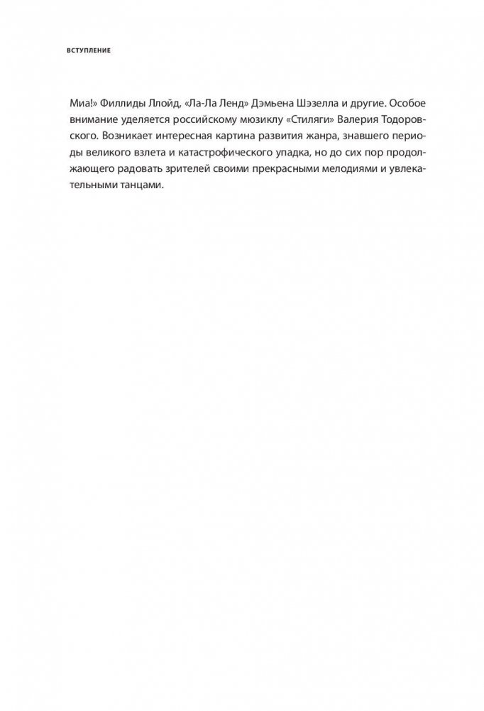 Шоу продолжается! Перед нами история мюзикла, одного из самых популярных жанров кино. Основоположник американского мюзикла Басби Беркли, великий артист Фред Астер и его партнерша Джинджер Роджерс, изумительный танцовщик и постановщик Джин Келли, выдающийся режиссер Винсент Миннелли и его дочь Лайза Миннелли. А также история мюзикла конца ХХ и первых двух десятилетий XXI века. Фильмы, вызвавшие в это время наибольший интерес зрителей: "Мулен Руж!" Бэза Лурмана, "Призрак Оперы" Джоэла Шумахера, "Суини Тодд: демон-парикмахер с Флит-стрит" Тима Бёртона, "Чикаго" Роба Маршалла, "Мамма Миа!" Филлиды Ллойд, "Ла-Ла Ленд" Дэмьена Шэзелла и другие. Особое внимание уделяется российскому мюзиклу "Стиляги" Валерия Тодоровского. Возникает интересная картина развития жанра, знавшего периоды великого взлета и катастрофического упадка, но до сих пор продолжающего радовать зрителей своими прекрасными мелодиями и увлекательными танцами. Иллюстрированное издание.