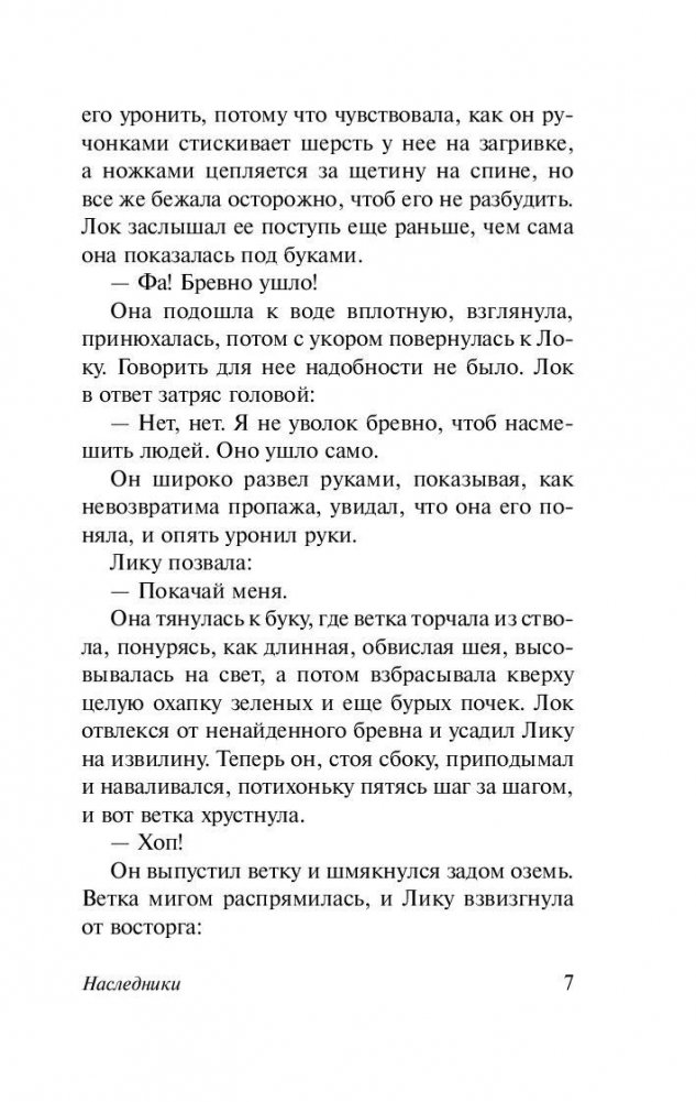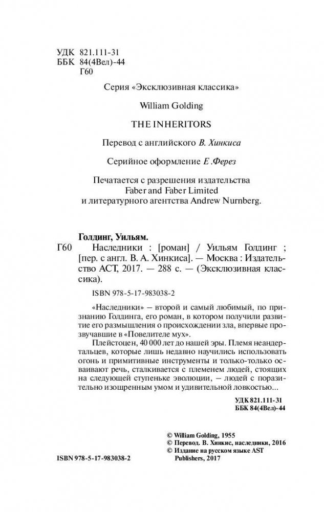 «Наследники» – второй и самый любимый, по признанию Голдинга, его роман, в котором получили развитие его размышления о происхождении зла, впервые прозвучавшие в «Повелителе мух». Плейстоцен, 40000 лет до нашей эры. Племя неандертальцев, которые лишь недавно научились использовать огонь и примитивные инструменты и только-только осваивают речь, сталкиваются с племенем людей, стоящих на следующей ступеньке эволюции – людей, с поразительно изощренным умом и удивительной ловкостью…