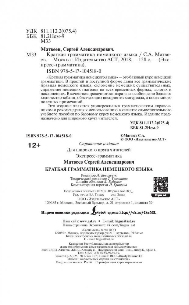 В простой и доступной форме даны все грамматические правила немецкого языка, склонение немецких существительных, спряжение немецких глаголов во всех временных формах, залогах и наклонениях. В качестве справочного аппарата в пособии дано большое количество таблиц, облегчающих восприятие материала, а также много полезных примечаний. Это издание является универсальным грамматическим справочником и рекомендуется к использованию в качестве самостоятельного учебного пособия по базовому курсу немецкого языка. Издание предназначено для широкого круга читателей.