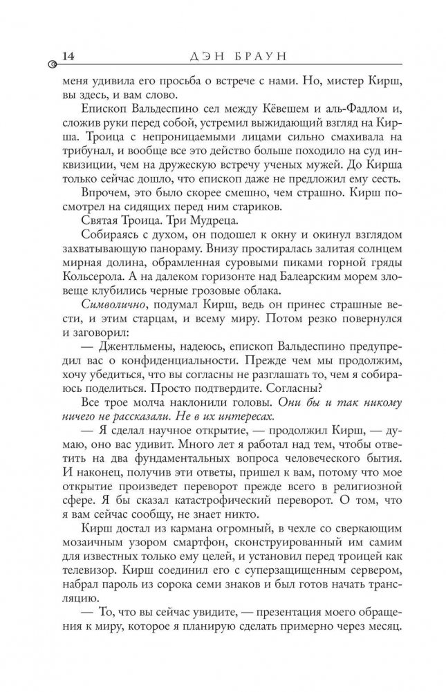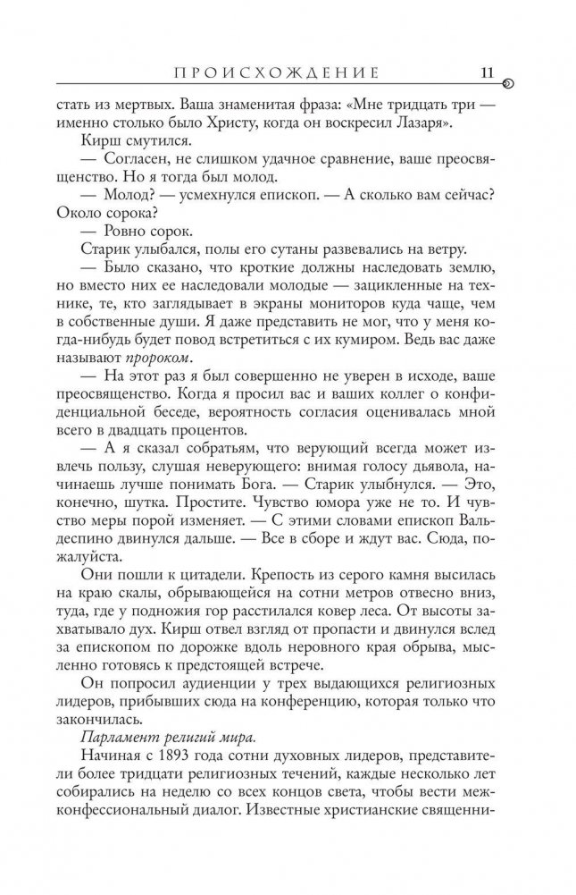 Роберт Лэнгдон прибывает в музей Гуггенхайма в Бильбао по приглашению друга и бывшего студента Эдмонда Кирша. Миллиардер и компьютерный гуру, он известен своими удивительными открытиями и предсказаниями. И этим вечером Кирш собирается "перевернуть все современные научные представления о мире", дав ответ на два главных вопроса, волнующих человечество на протяжении всей истории: Откуда мы? Что нас ждет? Однако прежде чем Эдмонд успевает сделать заявление, роскошный прием превращается в хаос. Лэнгдону и директору музея, красавице Амбре Видаль, чудом удается бежать. Теперь их путь лежит в Барселону, где Кирш оставил для своего учителя закодированный ключ к тайне, способной потрясти сами основы представлений человечества о себе. Тайне, которая была веками похоронена во тьме забвения. Тайне, которой, возможно, лучше бы никогда не увидеть света, — по крайней мере, так считают те, кто преследует Лэнгдона и Видаль и готов на все, чтобы помешать им раскрыть истину.