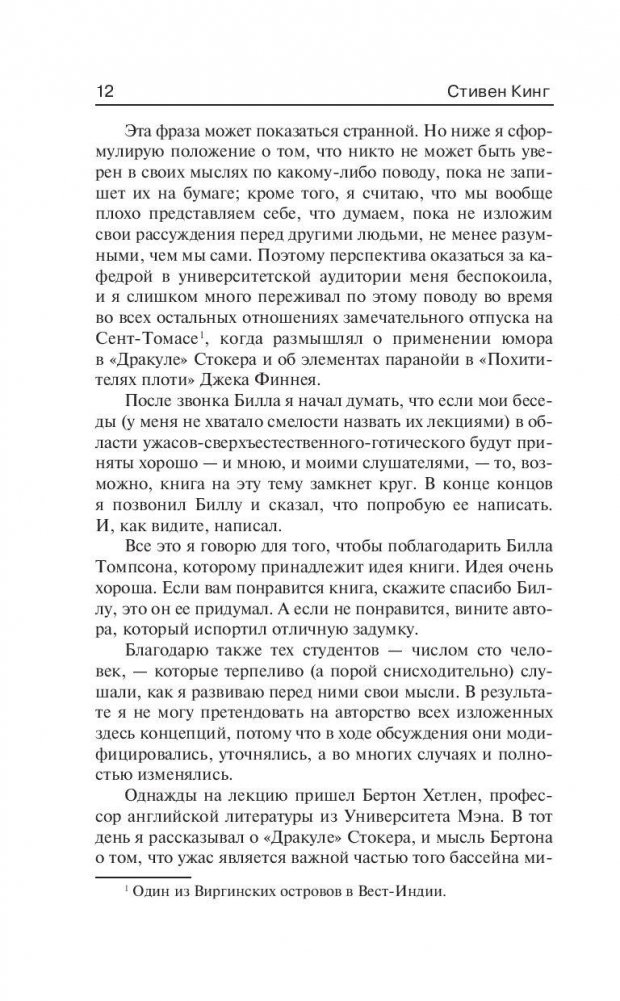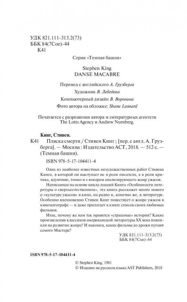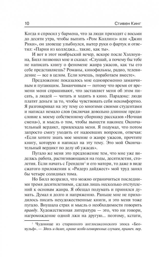Одна из наиболее известных нехудожественных работ Стивена Кинга, в которой он выступает не в роли писателя, а в роли критика, вдумчиво, тонко и с юмором анализирующего жанр ужасов. Написанная на основе цикла лекций Кинга "Особенности литературы о сверхъестественном", эта книга расскажет много нового о "культуре ужасов" в кино, на радио и, конечно же, в литературе. Особенно вдохновенно Стивен Кинг повествует о жанре ужасов в кинематографе — и даже прилагает к книге список своих любимых фильмов. Итак, почему же нам так нравятся "страшные" истории? Какие произведения классиков американской литературы ХХ века повлияли на развитие жанра? И, наконец, какие фильмы до дрожи пугают самого Мастера?