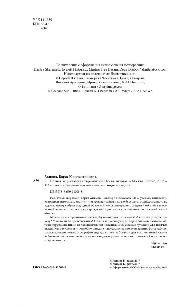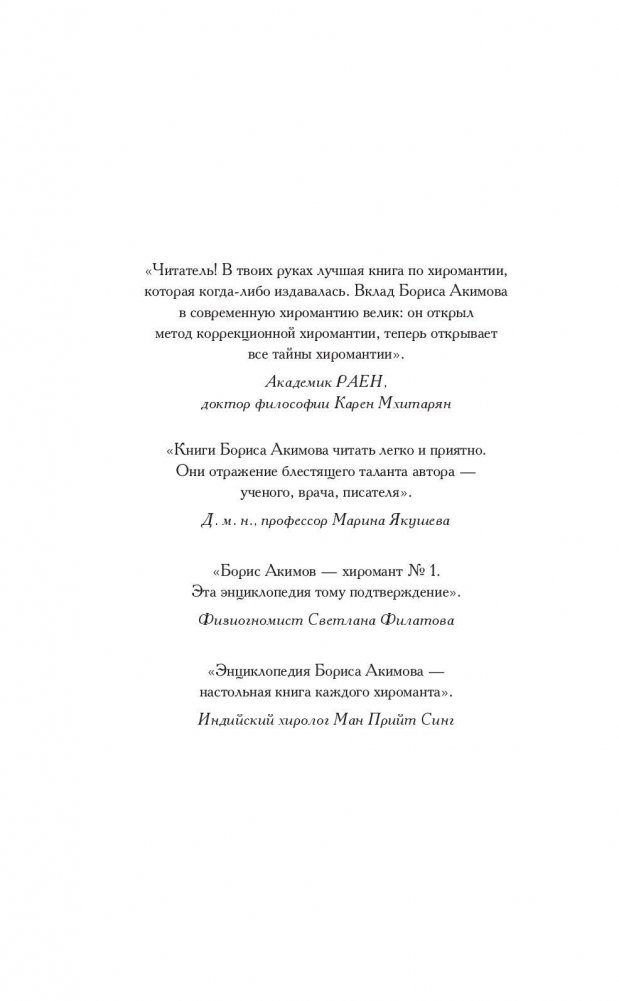 Известный хиромант Борис Акимов – эксперт телеканала ТВ 3, ученый, психолог и основатель школы хиромантии – открывает тайны нашего будущего, зашифрованного на ладони. Автор собрал под одной обложкой массу интересных сведений об этой таинственной науке – от момента ее зарождения и до самых современных достижений в этой области. Можем ли мы прочитать свою судьбу по линиям на ладонях? А если мы увидим там беду? Можно ли ее предотвратить? Можно и нужно, уверен Борис Акимов. Ведь его методы коррекции линий на ладони помогли изменить свою жизнь к лучшему уже тысячам людей. Как это сделать – подробно описано и показано на многочисленных фотографиях, которые делают метод хирографии еще доступнее. А бонусом для всех читателей станет небольшая заключительная глава, посвященная рукам известных личностей прошлого и современности.