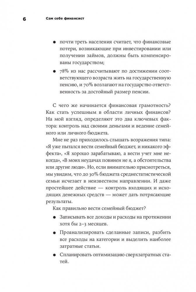 Отсутствие финансовой грамотности приводит к тому, что какая бы у нас ни была зарплата, мы не умеем планировать бюджет, никак не можем накопить на свою мечту, надеемся на государственную пенсию и начинаем жить в кредит. При этом есть мнение, что управление личными финансами слишком сложно и вообще это только для богатых. Цель этой книги — доказать, что любой человек, с любым уровнем доходов может улучшить свое благосостояние, следуя простым правилам. Финансовый консультант Анастасия Тарасова на понятных жизненных примерах рассказывает, как вести учет расходов и доходов, как оптимизировать свои активы и пассивы, как и куда инвестировать и накопить на пенсию и на будущее детей. В книге рассказывается о том: как заставить деньги работать; что такое подушка безопасности, и зачем она нужна; как оптимизировать доходы и расходы; как правильно ставить финансовые цели; как правильно управлять активами и пассивами; что происходит с пенсионной системой; как сформировать пенсию самостоятельно; как накопить на образование и жилье своим детям.