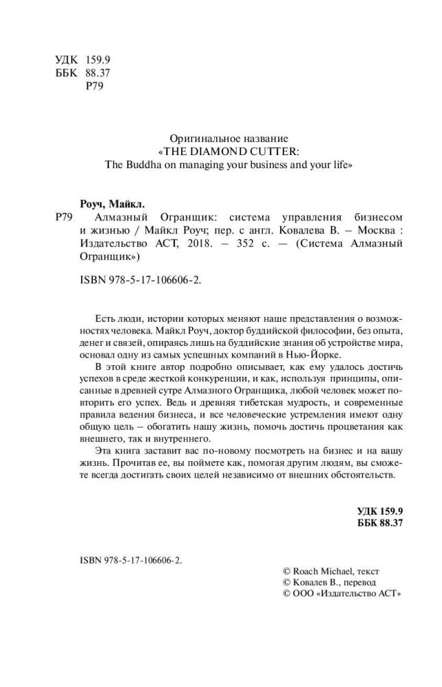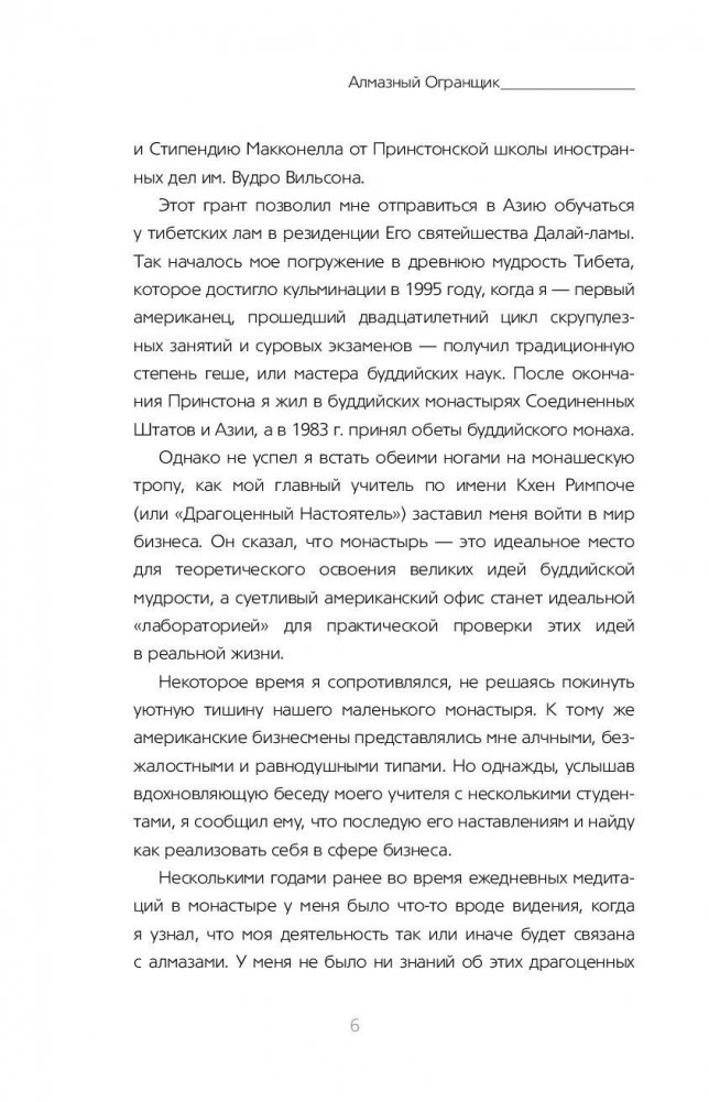 Есть люди, истории которых меняют наше представление о возможностях человека. Майкл Роуч, доктор буддийской философии, без опыта, денег и связей, опираясь лишь на буддийские знания об устройстве мира, основал одну из самых успешных компаний в Нью-Йорке. В этой книге автор подробно описывает, как ему удалось достичь успехов в среде жесткой конкуренции, и как, используя принципы, описанные в древней сутре Алмазного Огранщика, любой человек может повторить его успех. Ведь и древняя тибетская мудрость, и современные правила ведения бизнеса, и все человеческие устремления имеют одну общую цель – обогатить нашу жизнь, помочь достичь процветания как внешнего, так и внутреннего. Эта книга заставит вас по-новому посмотреть на бизнес и на вашу жизнь. Прочитав ее, вы поймете как, помогая другим людям, вы сможете всегда достигать своих целей независимо от внешних обстоятельств.