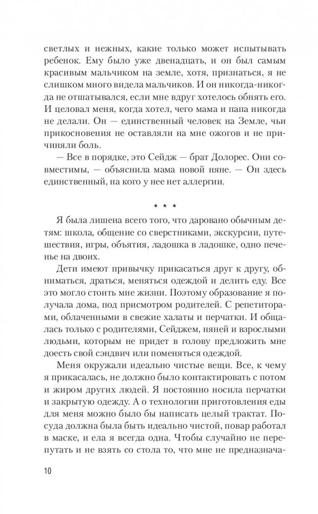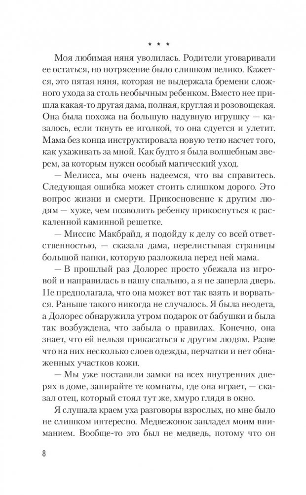 Меня зовут Долорес Макбрайд, и я с рождения страдаю от очень редкой формы аллергии: прикосновения к другим людям вызывают у меня сильнейшие ожоги. Я не могу поцеловать парня, обнять родителей, выйти из дому, не надев перчатки. Я неприкасаемая. Я словно живу в заколдованном замке, который держит меня в плену и наказывает ожогами и шрамами за каждую попытку «побега». Даже придумала имя для своей тюрьмы: Стигмалион. Меня уже не приводит в отчаяние мысль, что я всю жизнь буду пленницей своего диагноза — и пленницей умру. Я не тешу себя мечтами, что от моей болезни изобретут лекарство, и не рассчитываю, что встречу человека, не оставляющего на мне ожогов… Но до чего же это живучее чувство — надежда. А вдруг я все-таки совершу побег из Стигмалиона? Вдруг и я смогу однажды познать все это: прикосновения, объятия, поцелуи, безумство, свободу, любовь?