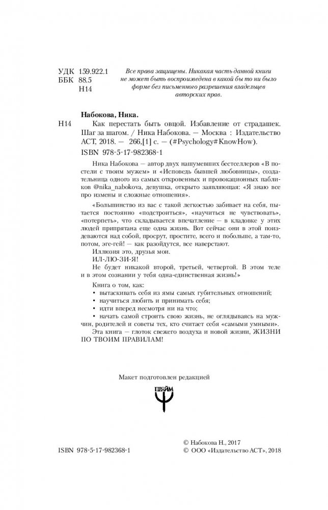 Ника Набокова — автор двух нашумевших бестселлеров «В постели с твоим мужем» и «Исповедь бывшей любовницы», создательница одного из самых откровенных и провокационных пабликов @nika_nabokova, девушка, открыто заявляющая: «Я знаю все про измены и сложные отношения».