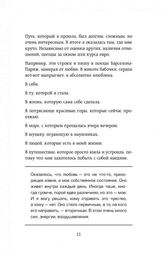 «Большинство из вас с такой легкостью забивает на себя, пытается постоянно „подстроиться“, „научиться не чувствовать“, „потерпеть“, что складывается впечатление — в кладовке у этих людей припрятана еще одна жизнь. Вот сейчас они в этой поиздеваются над собой, просрут, простите, всего и побольше, а там-то, потом, эге-гей! — как разойдутся, все наверстают.