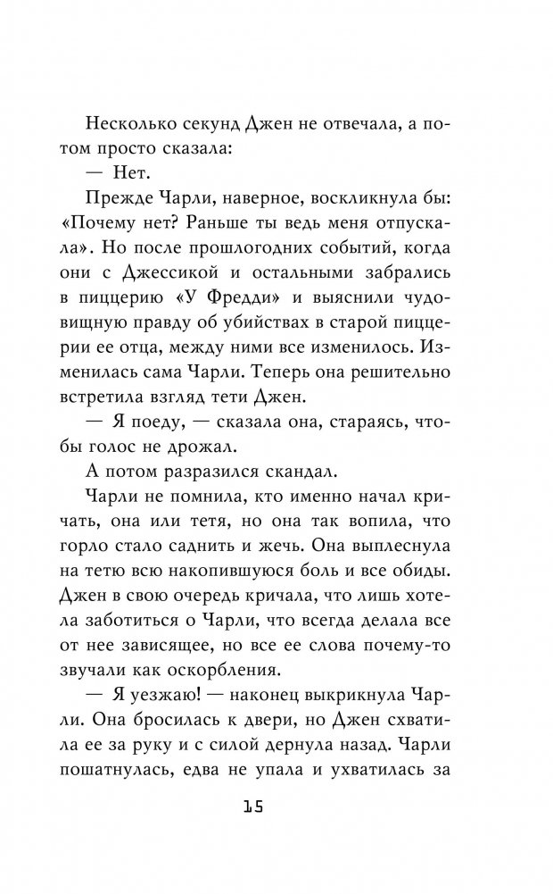 Как бы Чарли ни хотела забыть прошлое, у нее не выходит. Воспоминания преследуют ее, а лицо маньяка, от чьей руки они едва не погибли год назад, стоит перед глазами. Но, похоже, кошмар начинается снова. Неподалеку от школы Чарли находят изуродованные тела с характерными отметинами. Неужели кто-то другой начал собирать свою кровавую жатву? Ведь Дэйв умер, разве не так? У Чарли нет времени — нужно действовать быстро, потому что на нее открыта охота и никакие друзья на этот раз не спасут девушку... "Five Nights at Freddy’s" — культовая компьютерная игра в жанре хоррор, которая стала одной из самых популярных игр в своем жанре, а также удостоилась высоких оценок критиков за уникальный подход. Роман расширяет вселенную "Five Nights at Freddy’s", позволяя читателю не только проникнуться духом игры, но и узнать предысторию событий.