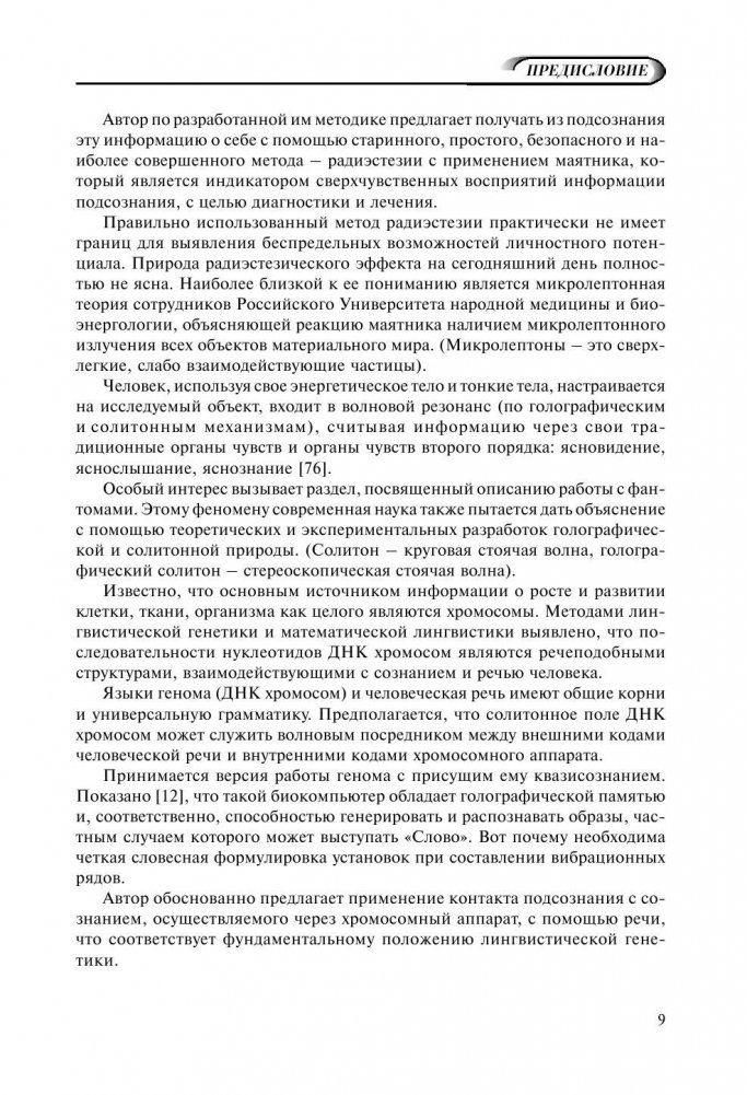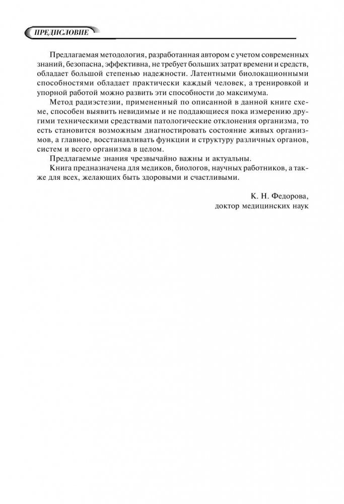 В книге излагается разработанная автором и не имеющая аналогов в мире система (само) диагностики и (само) исцеления человека, базирующаяся на радиэстезическом методе (биолокации) и использующая все самое ценное из древней восточной медицины, достижения современной медицины и фундаментальной науки в целом, результаты исследований и практический опыт автора и ее учеников. Эта система позволяет, прежде всего, выявлять невидимые и пока нерегистрируемые никакими другими средствами патологические отклонения организма, то есть проводить раннюю диагностику онкологических, инфекционных, психических, психосоматических и других заболеваний, определять глубинные причины этих заболеваний и находить наиболее эффективные пути исцеления для конкретного человека. Используя данную систему, можно легко решить множество практических задач, таких как: можно ли употреблять в пищу тот или иной продукт, носить ту или иную одежду, украшения, пользоваться той или иной косметикой, строить дом на выбранном месте, как безопасно для здоровья расставить мебель в доме и офисе и др. Предлагаемая методология абсолютно безопасна, эффективна, не требует больших затрат времени и средств, обладает большой степенью надежности. Ее может освоить и эффективно использовать, практически, каждый человек. Книга предназначена для медиков, биологов, научных работников, а также для всех, кто желает быть здоровым и счастливым. Данная книга является учебным и научным пособием для врачей всех специальностей, интересующихся нетрадиционными способами диагностики и лечения.
