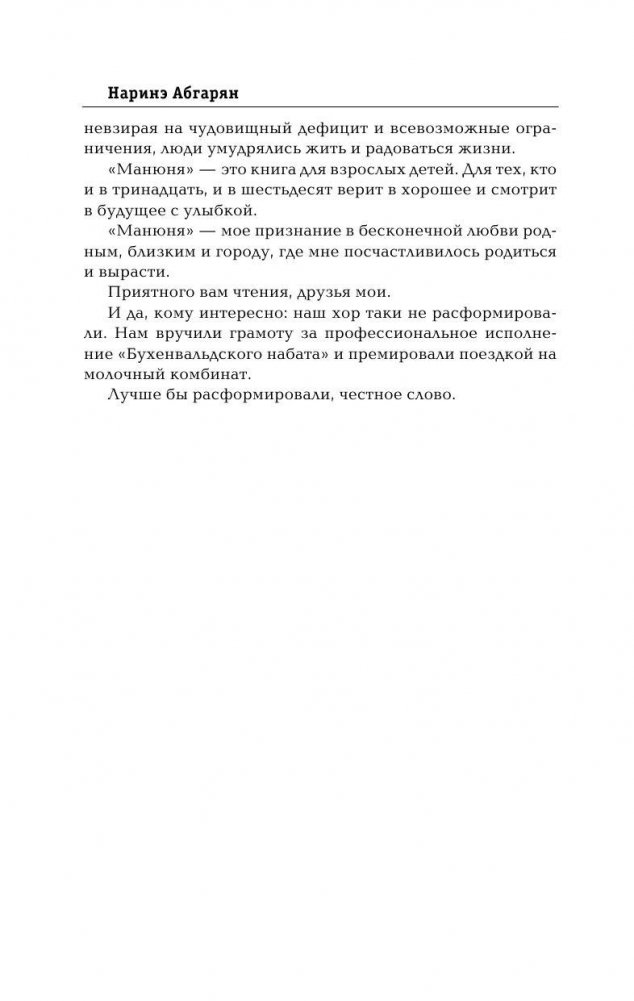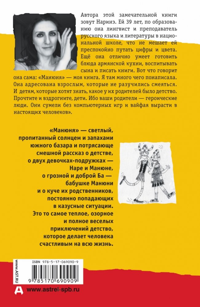 "Манюня" - светлый, пропитанный солнцем и запахами южного базара и потрясающе смешной рассказ о детстве, о двух девочках-подружках Наре и Манюне, о грозной и доброй Ба - бабушке Манюни, и о куче их родственников, постоянно попадающих в казусные ситуации. Это то самое теплое, озорное и полное веселых приключений детство, которое делает человека счастливым на всю жизнь. Книга - лауреат премии "Рукопись года".