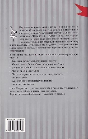 Эта книга о том, что компьютерной проблемы не существует. Дети и подростки прирастают к розетке тогда, когда реальный мир не может предложить им других полноценных занятий. "Зависание" может быть необходимой частью роста личности, данью моде или результатом проблем общения - со сверстниками, с семьей, с миром. Поэтому не надо бороться с компьютером, борьба не укрепляет семьи. Надо просто понять истинные потребности своих детей - и найти в себе силы и время общаться, играть, слушать их. Просто смотреть на все (в том числе и на комп, ТВ, мобильник, плеер и прочие розеточные изобретения) глазами детей и подростков. И тогда виртуальный мир станет помощником вашей семье, для чего он, собственно, и предназначен.