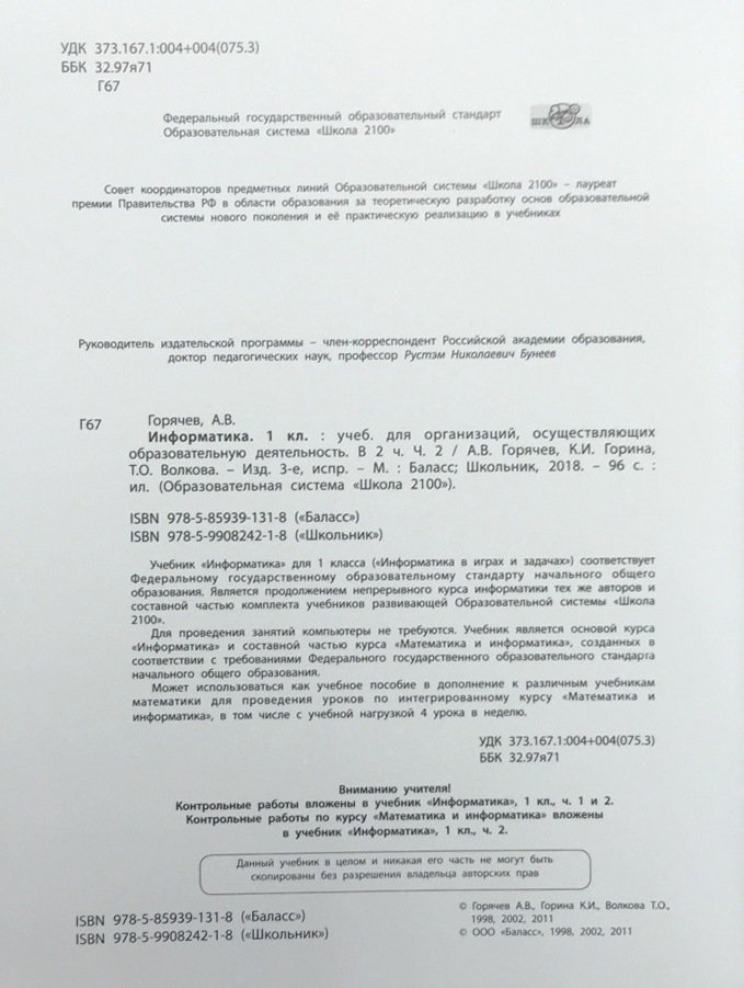 Учебник предназначен для 1-го класса общеобразовательной четырехлетней начальной школы. Соответствует Федеральному государственному образовательному стандарту начального общего образования, является продолжением непрерывного курса информатики и составной частью комплекта учебников развивающей Образовательной системы «Школа 2100». Для проведения занятий компьютеры не требуются. Учебник является основой курса «Информатика» и составной частью курса «Математика и информатика», созданного в соответствии с требованиями Федерального государственного образовательного стандарта начального общего образования. Методические рекомендации с подробными поурочными разработками позволяют вести данный курс учителям начальных классов без специальной подготовки.