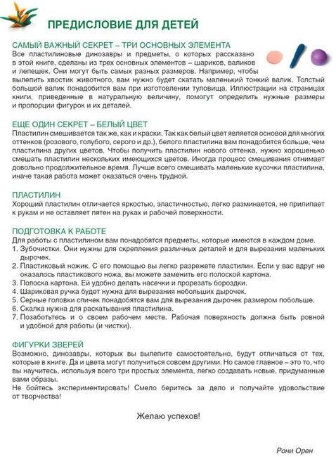 На занятиях Рони Орена, профессора израильской академии искусств "Бецалел", малыши не просто играют, они думают, фантазируют, делают открытия и конечно же учатся любить природу. На этот раз маленькие читатели смогут совершить увлекательное путешествие во времени и познакомиться с удивительными животными, которые жили на нашей планете миллионы лет назад. Таинственный мир динозавров будоражит воображение и не оставляет никого равнодушным. Малыши с интересом будут лепить их фигурки из пластилина и изучать историю. Рони Орен - известный художник и педагог. Он иллюстрировал более 30 детских книг. Многочисленные мультипликационные сериалы для детей, выполненные Рони Ореном методом анимации, многократно транслировались по ведущим мировым телеканалам: Би-би-си, "Уолт Дисней", 4-й британский канал и др.